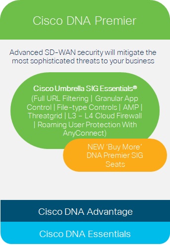 The combination of Cisco SD-WAN and Cisco Umbrella in a Cisco DNA Premier subscription for SD-WAN and Routing is the path to Cisco’s SASE solution. The Cisco DNA Premier for SD-WAN and Routing license includes Cisco Umbrella SIG Essentials, a cloud-native solution that unifies multiple security functions in a single cloud service to secure internet access and control cloud app usage across networks, branch offices, and roaming users. Unlike disparate tools, Umbrella unifies: