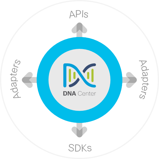 These applications are all built around new automated network management capabilities using an open platform. The DNA Center open platform provides 360-degree extensibility so that your intent-based network can continuously align with your organization’s business applications, integrate with your IT processes, and deliver better network experiences.