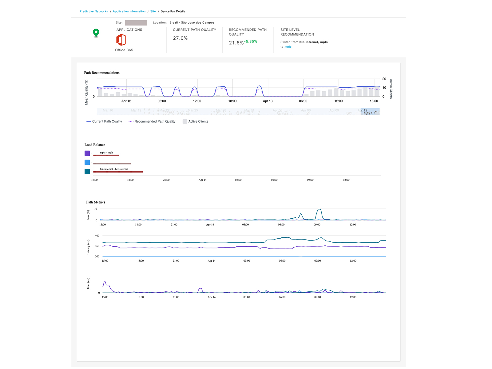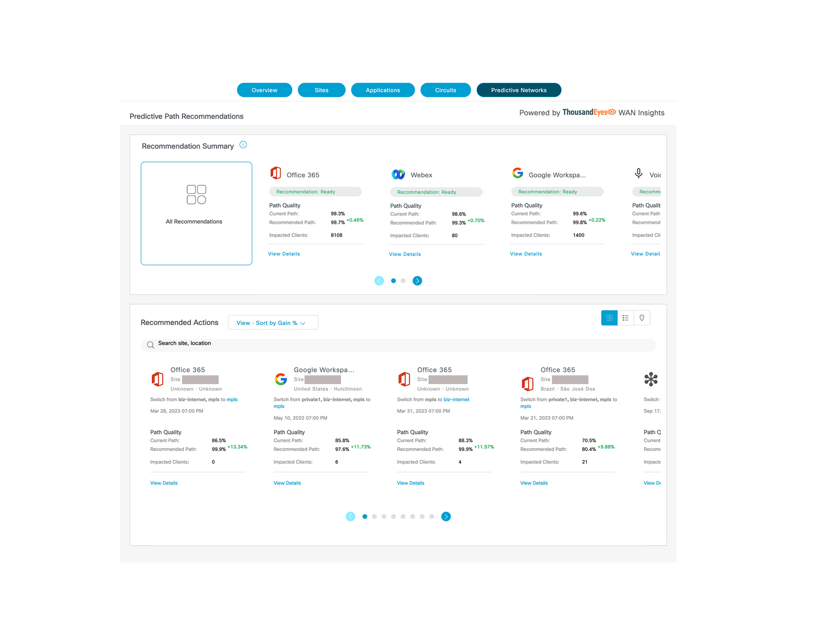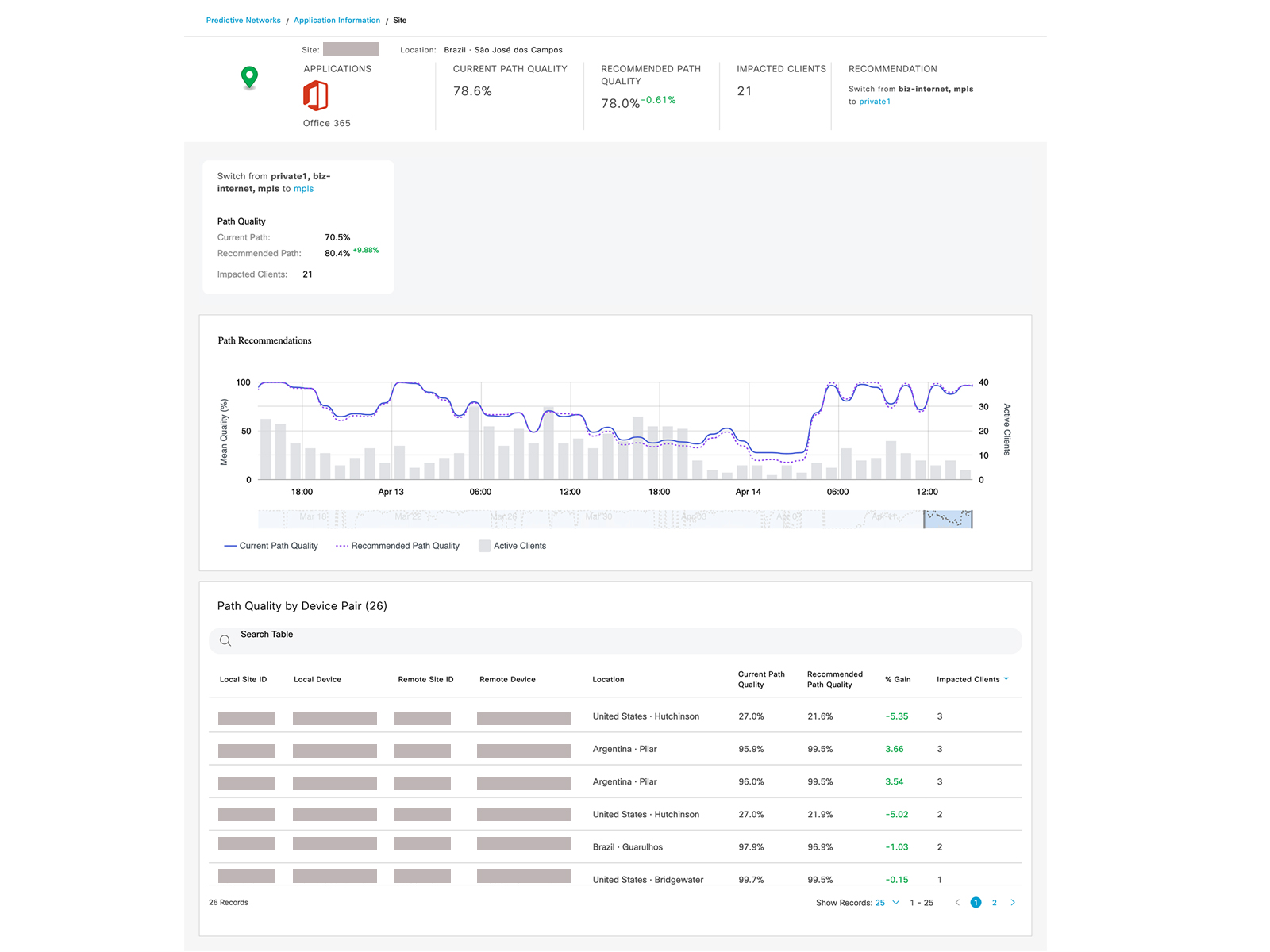 SD-WAN administrators can find additional insights into the historical performance of the current path versus recommended path in terms of path quality and impacted users specific to an Application Group at a specific site. In addition, the aggregated metrics for the entire site are also available, which helps Admins identify circuits and paths which are problematic. This view is helpful in understanding the impact of policy change based on model recommendations.