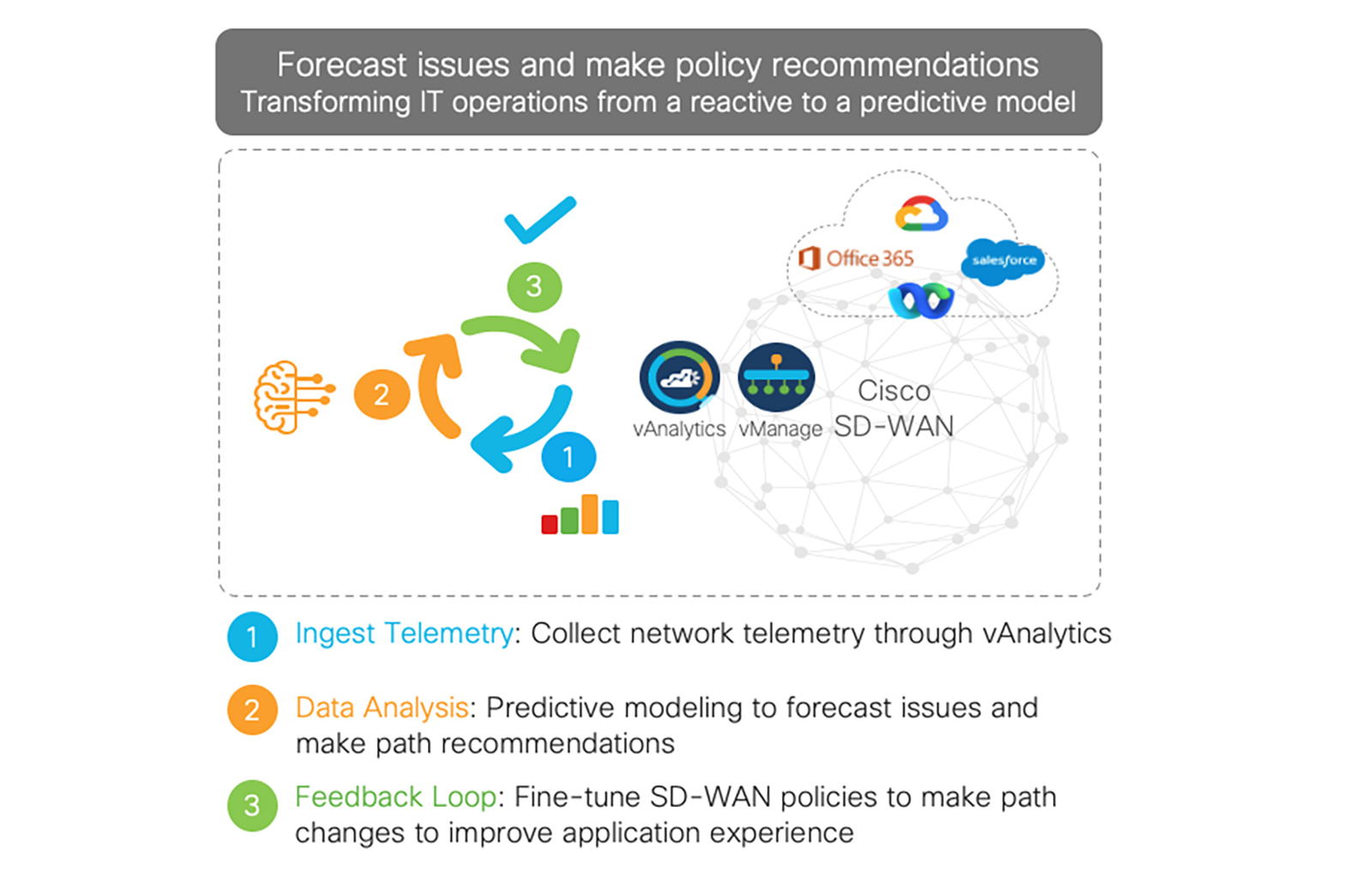 Integrating Cisco ThousandEyes Predictive Path Recommendation with Cisco SD-WAN vManage provides IT with a proactive solution with actionable recommendations to reduce disruptions in network fabric while simplifying network operations. The predictive solution helps to improve the application experience by avoiding network degradation before it happens. It enables operations personnel to work more efficiently and to focus on strategic activities rather than reactive triage. Moreover, Predictive Path Recommendation provides the foundation for intelligent closed-loop network automation.