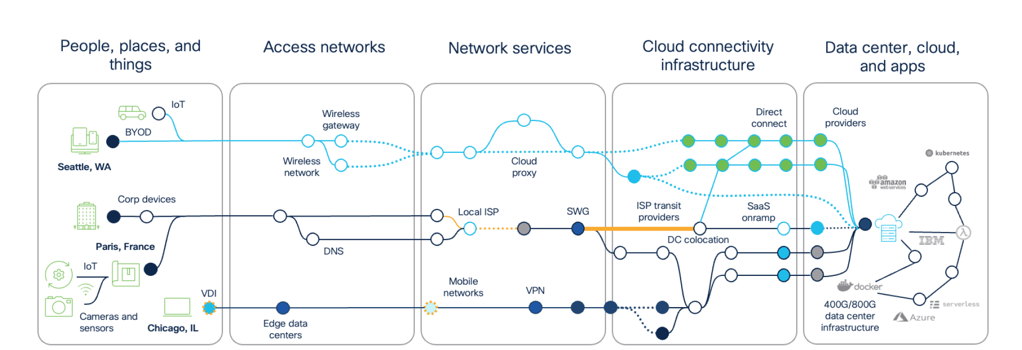 Providing network assurance for a high-quality connected experience today requires end-to-end visibility and insights across diverse clouds, network providers, the internet, devices, and geographies—each with their own operational domains (see Figure 1). Without end-to-end visibility into network performance, application responsiveness, and security, it is extremely challenging for IT teams to deliver consistent digital experiences to end users.