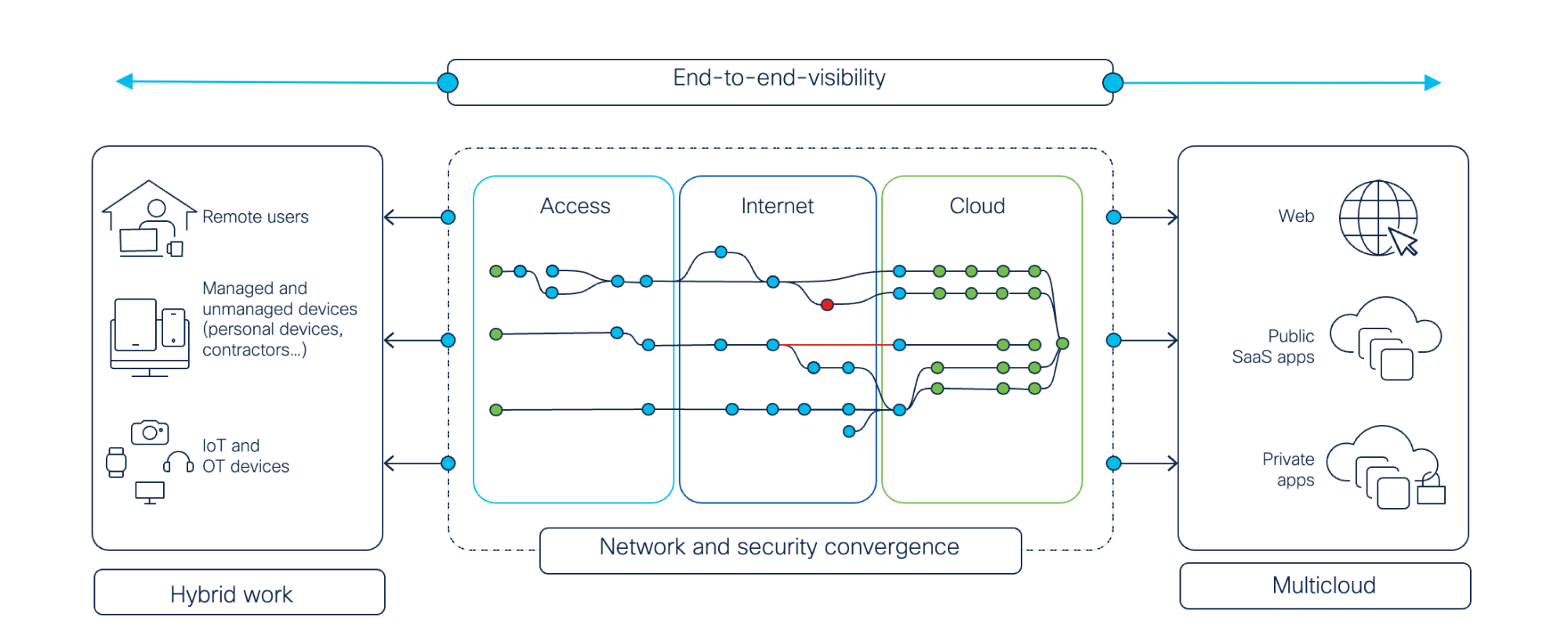 End-to-end visibility, analytics, and operational workflows allow admins to take decisive action to proactively remediate connectivity issues. In a secure access service edge (SASE) architecture, for example, end-to-end visibility feeds the actionable intelligence used to optimize path selection to provide the best digital experience anywhere at any time. Reliable connectivity is foundational to securely connecting people and things in a SASE architecture. If connectivity is poor, the secure access experience will be degraded.