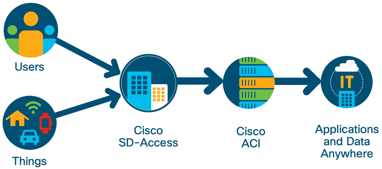 In enterprise networks, Cisco’s SD-Access solution has replaced the need for IP-address-based access control, and its associated manual configurations, with management by identity-based groups in which users and devices are assigned to groups. In the data center, Cisco ACI uses a similar grouping method for applications. Both SD-Access and ACI associate security policies with these groups. With the new integration, SD-Access will transmit information to ACI about the user and device groups it creates and will, in turn, learn of the groups ACI creates for applications. This exchange will allow SD-Access and ACI to learn and enforce each other’s policies in their respective networks, leveraging Cisco Identity Services Engine (ISE) as the common broker.