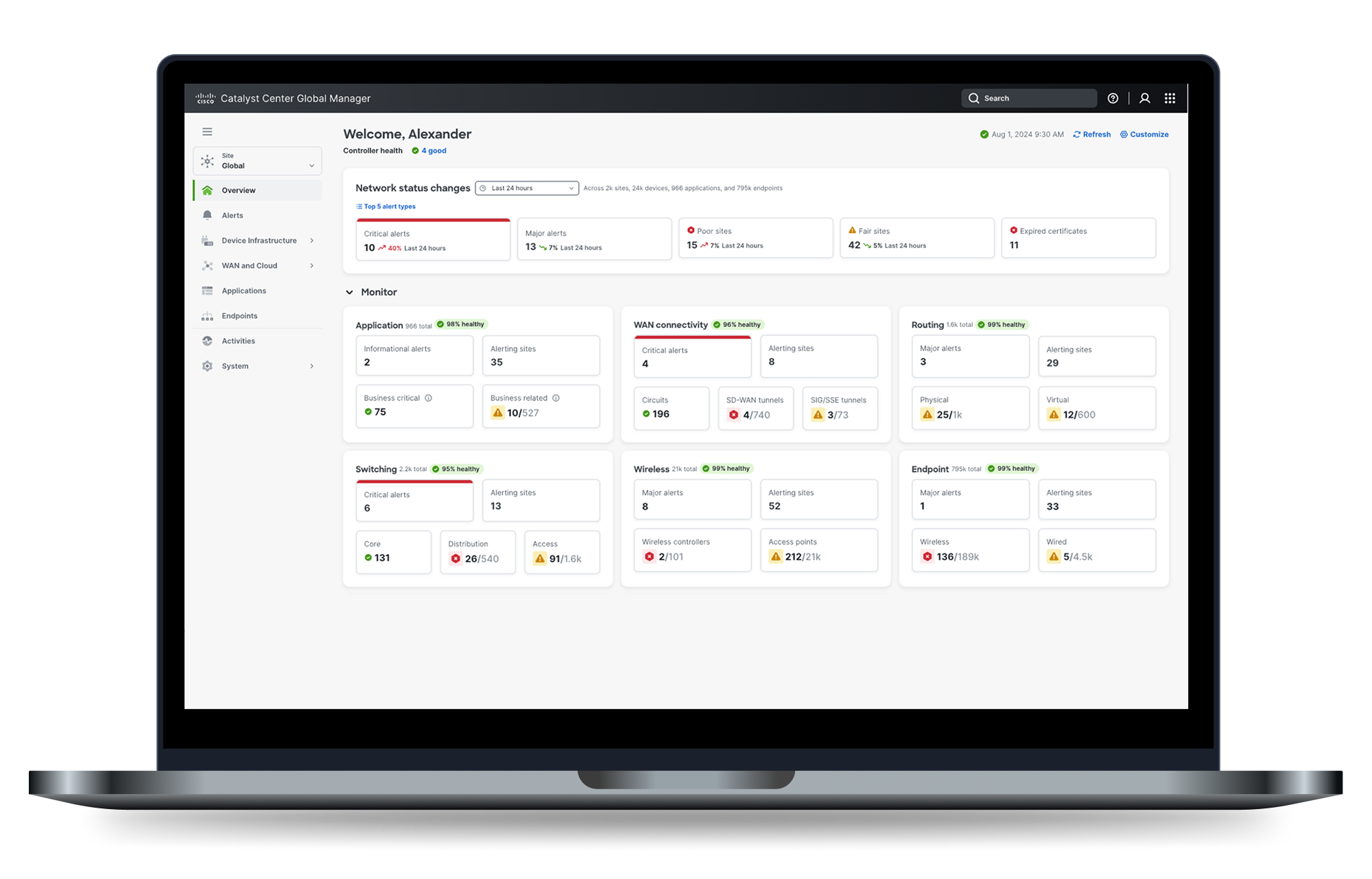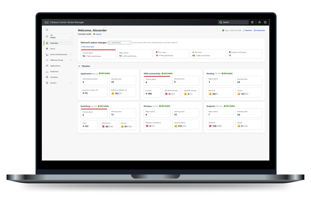 - Catalyst Center Global Manager: Manage every location across your globally dispersed, multisite networks through a centralized dashboard for greater visibility and operational efficiency. Easily scale to thousands of devices and endpoints. With built-in multilayered assurance, you can proactively resolve issues for minimal downtime and maximum productivity.