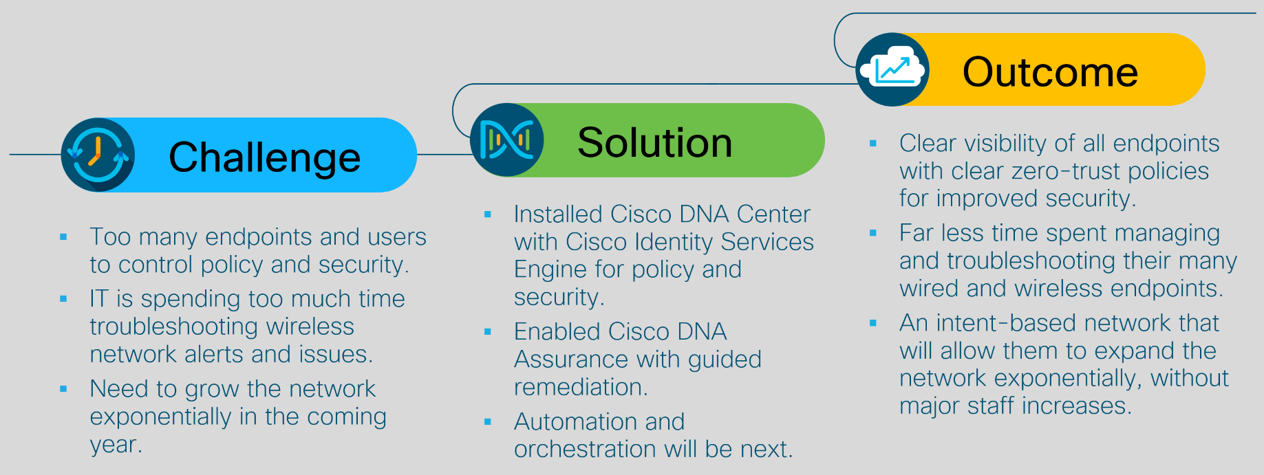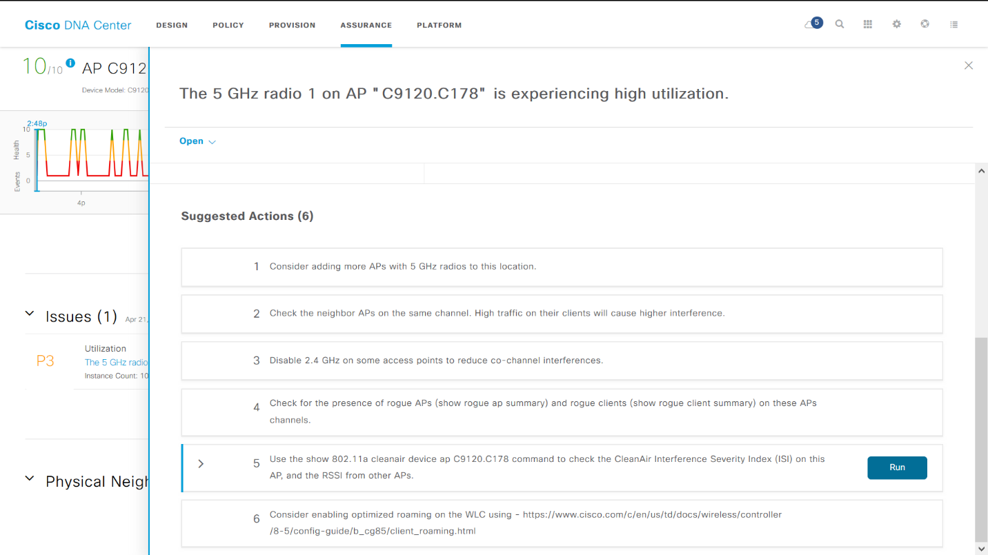 Now the team can focus on operating a policy-based, zero-trust infrastructure. Doing this is a cinch with Cisco DNA Assurance, one of the main features in Cisco DNA Center. As I noted above, there was inconsistency in the IT staff proficiency in managing complex network issues and troubleshooting. Meaning that some of the level-one engineers did not have the experience to diagnose complex issues without consulting a more experienced staff member. When Cisco DNA Assurance raises a network “Issue” it then offers guided remediation on steps to resolve that issue (see screenshot below). Any suggestion that can be resolved through a Cisco DNA Center configuration will have a “RUN” button next to it, for one-click resolution. This allows level-one engineers to fix complex network challenges quickly and independently. It also serves as a platform for learning as each issue that is remediated provides greater experience and, ultimately, improved network literacy.