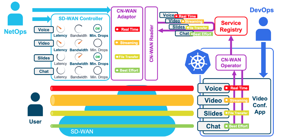 This week at KubeCon Europe 2020, we introduced the Cloud-Native SD-WAN (CN-WAN) project to improve SD-WAN and Kubernetes integration. CN-WAN is a reference open-source implementation that illustrates how SD-WAN solutions, such as Cisco Viptela SD-WAN, can seamlessly integrate with the Kubernetes ecosystem to become aware of the needs of Cloud-Native applications. CN-WAN maps Kubernetes application attributes to SD-WAN network capabilities to automatically optimize the application performance over the WAN.