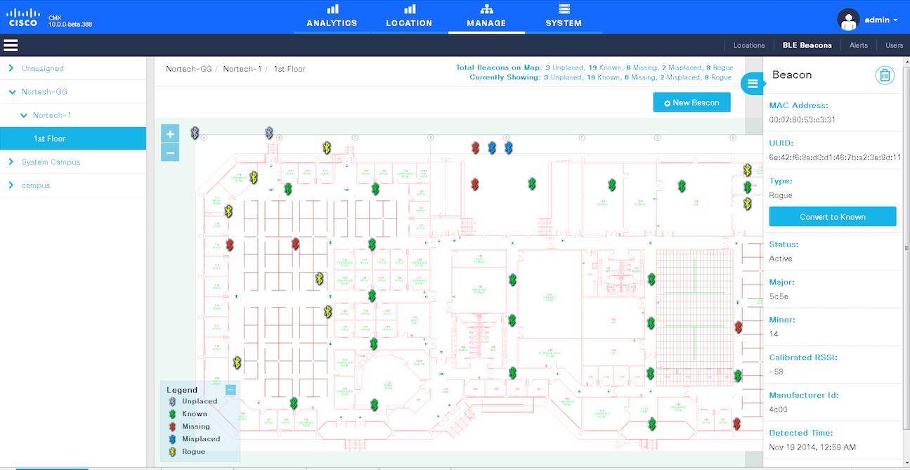 Cisco’s Connected Mobile Experiences or CMX 10.0 provides a beacon management platform that automatically detects the location of beacons and places them on an indoor map. It allows the user to give a name to the beacon, identify the beacon as a known (vs. rogue) beacon, and alerts the user if a beacon goes missing.