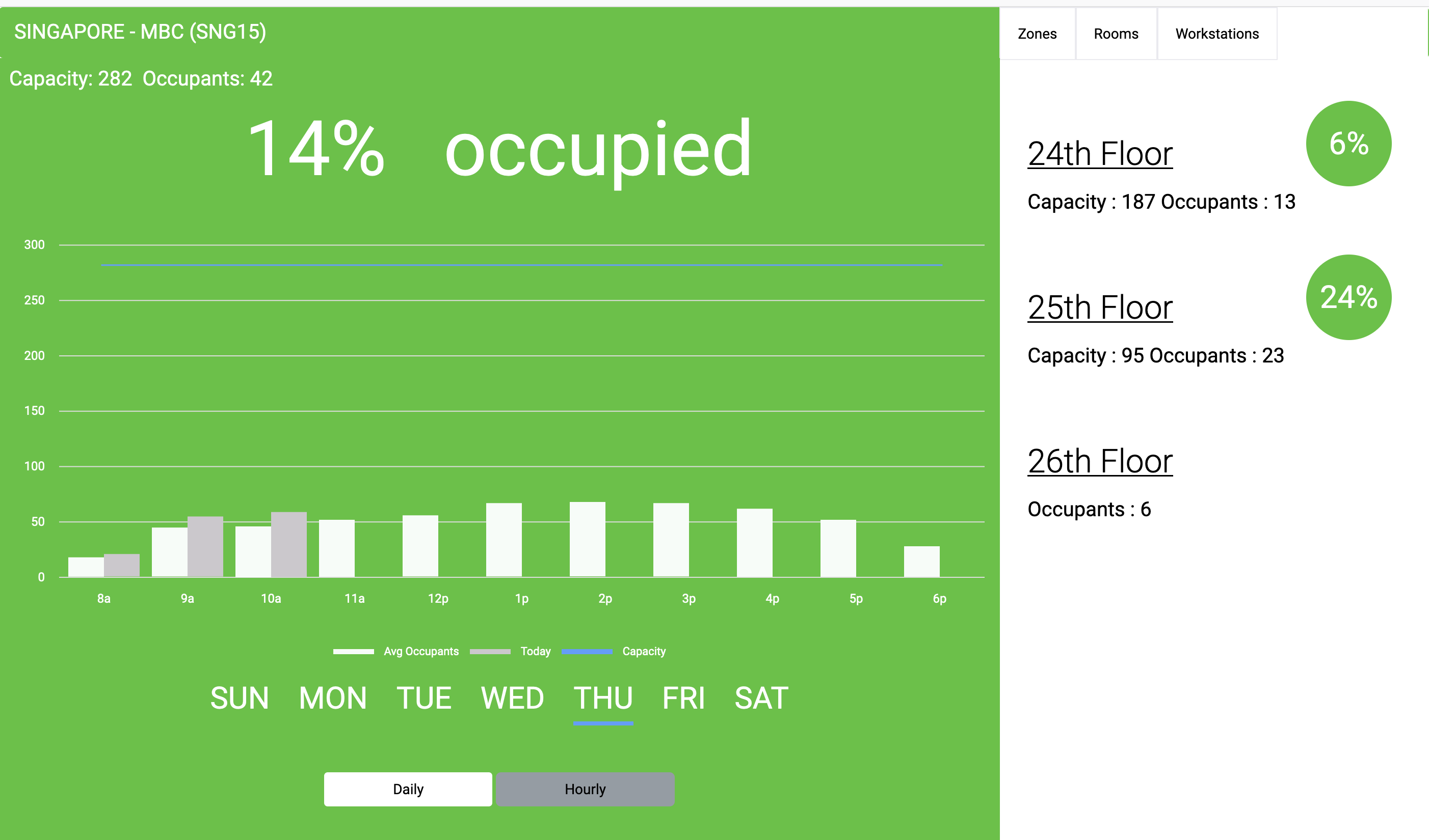 Recently, our partners in the Workplace Resources team leveraged the Firehose API from Cisco DNA Spaces to incorporate the wireless density data into their density dashboard.  The API trigger is used to display real time density status on a visual, intuitive dashboard. For Cisco Singapore below, we can easily see that one of the buildings is being occupied below the maximum capacity rule, meaning the building is safe to enter. This dashboard will update in real-time as people enter or exit, so that we can proactively keep our spaces safe. We can look at average occupancy on a daily or hourly basis and can count current occupants in buildings and floors. These analytics help us decide whether we should proceed with return to office or work from home.