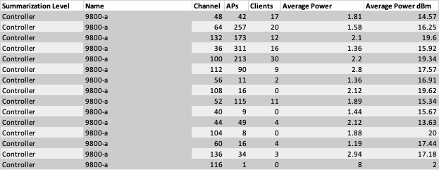 The easiest way to know the average power level per site is to use WCAE tool and check the “Channel Stats 5GHz” tab. This will present a summary per channel, either at controller, or site tag level, of the average power levels (among other information). For example, this is a network where migration to 6GHz may need additional access points:
