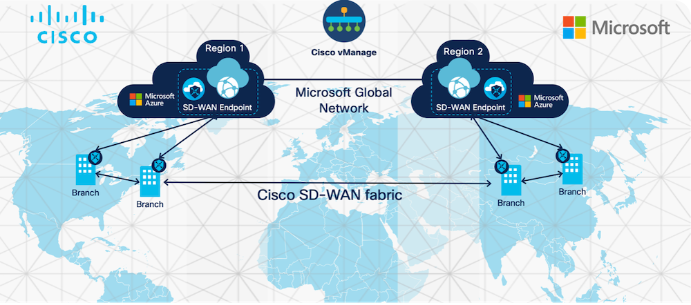 With the new paradigm, the integrated architecture uses Cisco SD-WAN Network Virtual Appliances (NVAs) deployed in the virtual hubs and extends SD-WAN fabric to Azure cloud. This unique approach also enables native peering with Microsoft Virtual WAN Routing and Security Services and this entire network fabric can be managed from a single pane of glass with automatic high availability, scalability, and security. It provides you with a myriad of benefits from native BGP peering for better throughput and performance, to global connectivity between Virtual WAN hubs through Microsoft’s global backbone network.