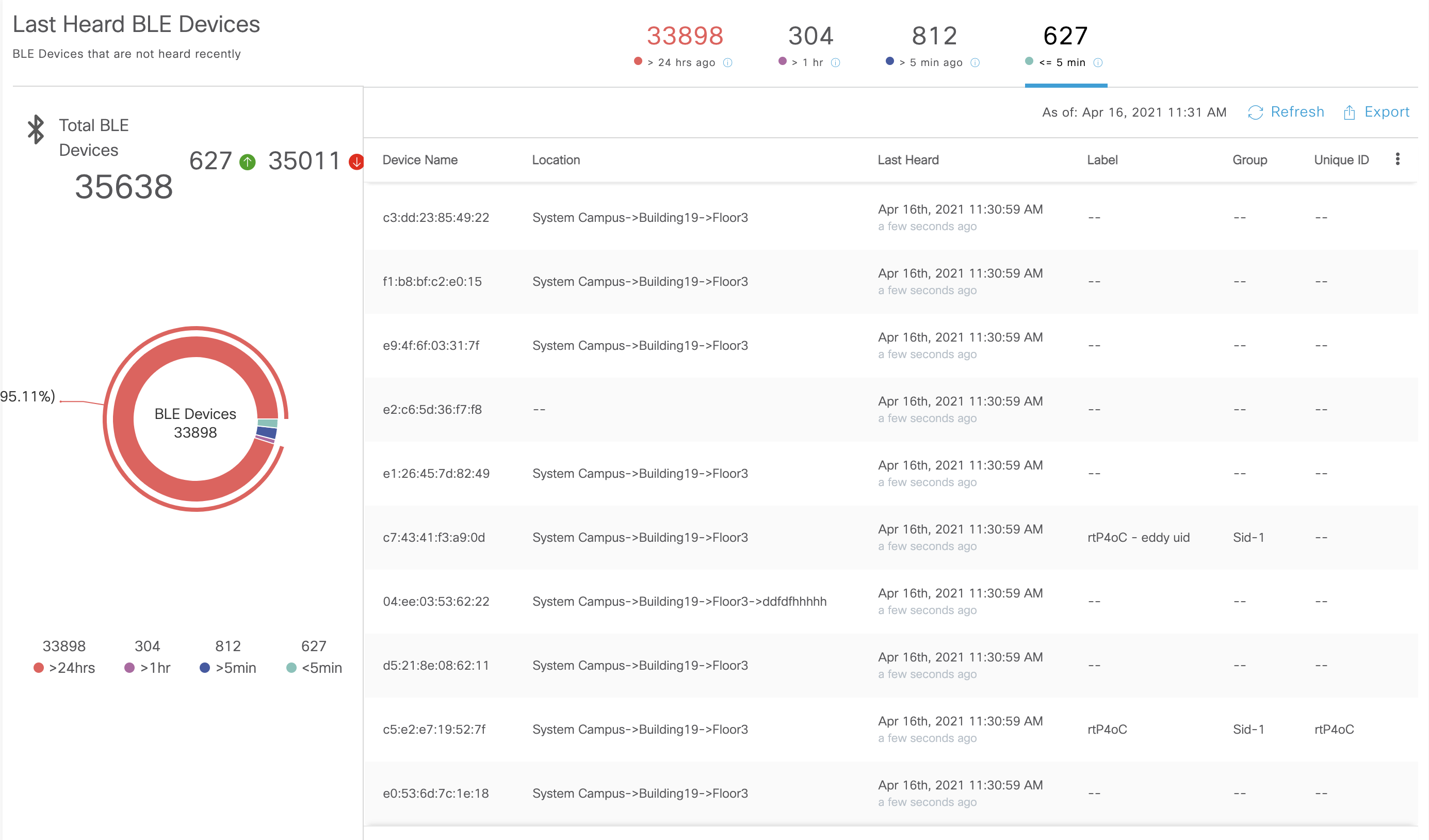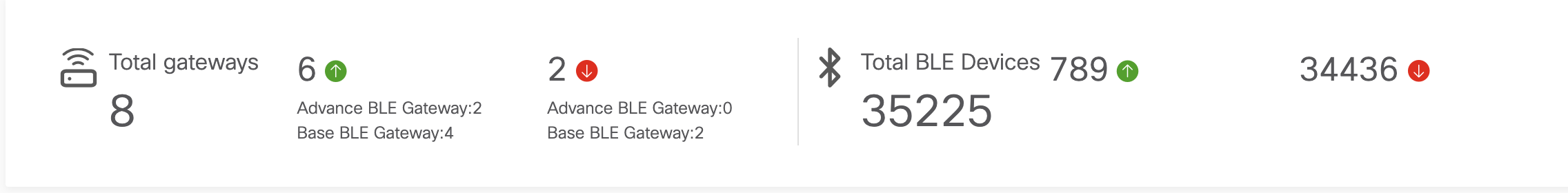 IoT Services provides a snapshot to quickly identify if any Gateway is down in the environment. It also identifies the total number of transmitting IoT devices and how many devices are active currently. This quickly provides customers with an idea of how cluttered the BLE environment in the enterprise may be.