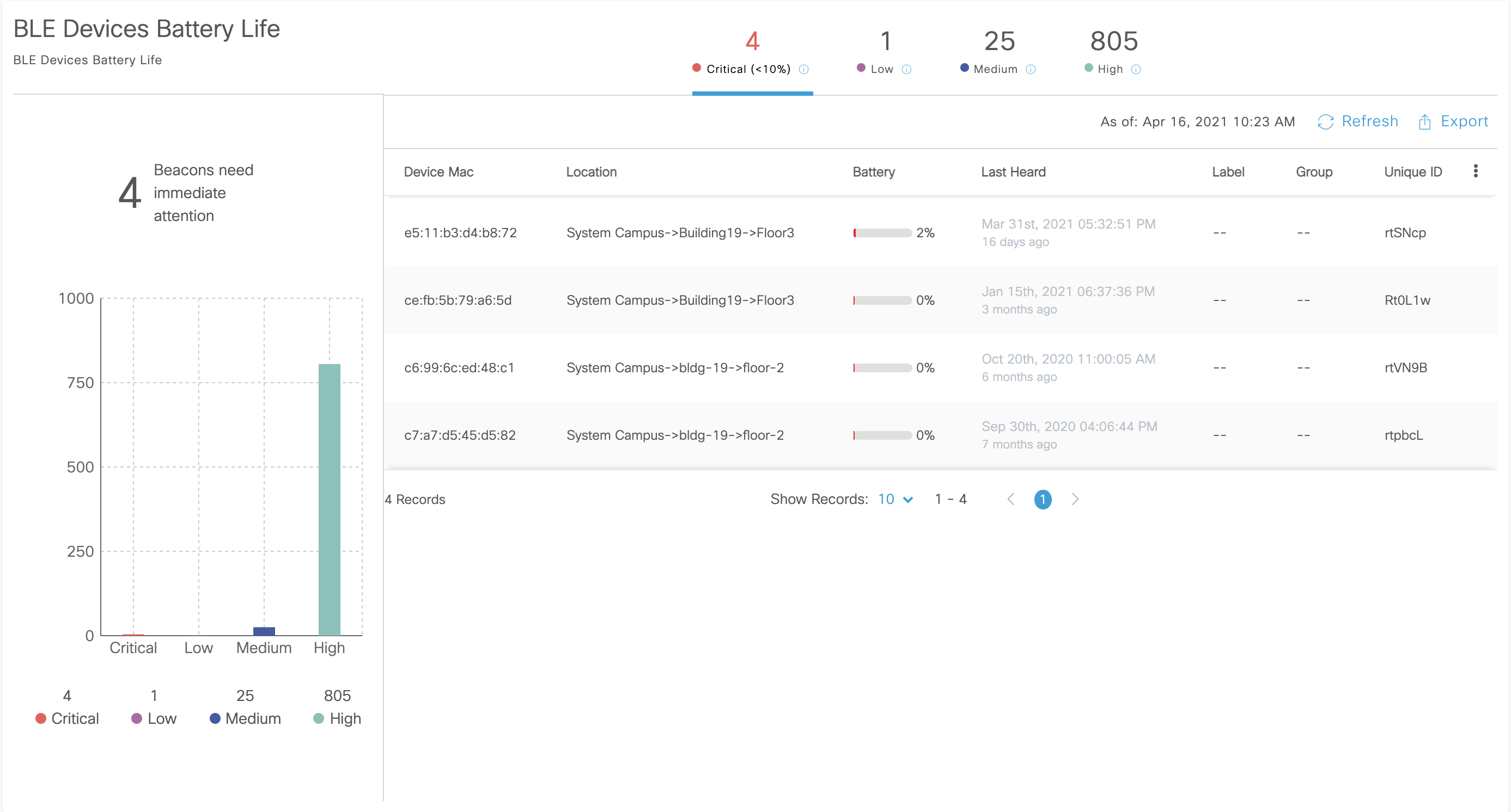 Unmonitored devices running out of battery is one of the primary causes of IoT network failures. It adversely affects almost all IoT use cases such as wayfinding, sensor telemetry. Devices advertising with high frequency or transmission power are particularly susceptible to battery drainage. Device monitoring provides a concise view of identifying devices that have critical or low battery life. It also provides information to locate the devices on a map so that network administrators can easily find the device and change its battery.