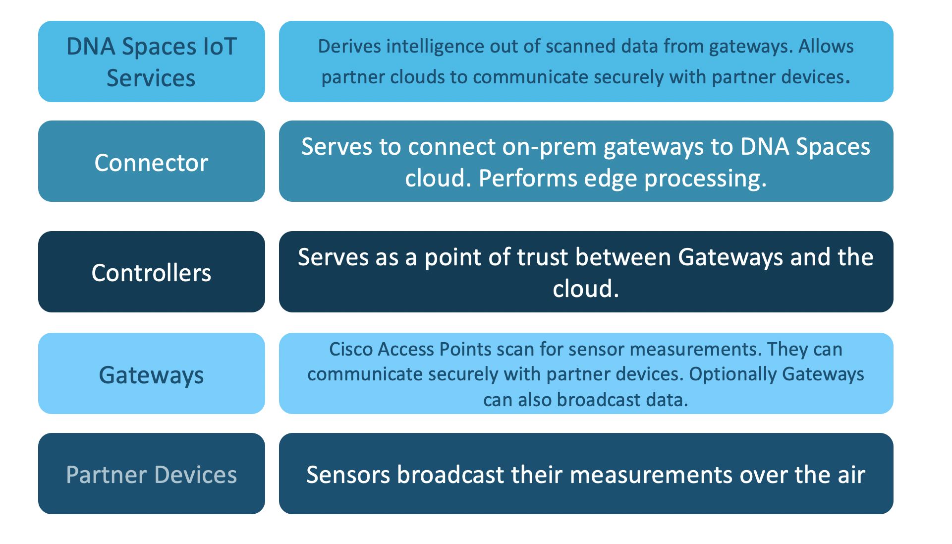 The key components of the solution are comprised of Cisco DNA Spaces IoT Services, Cisco Catalyst 9800 Series Wireless Controllers, Cisco Access Points, and our IoT Partner Ecosystem. The specific roles of each piece of the solution are described below: