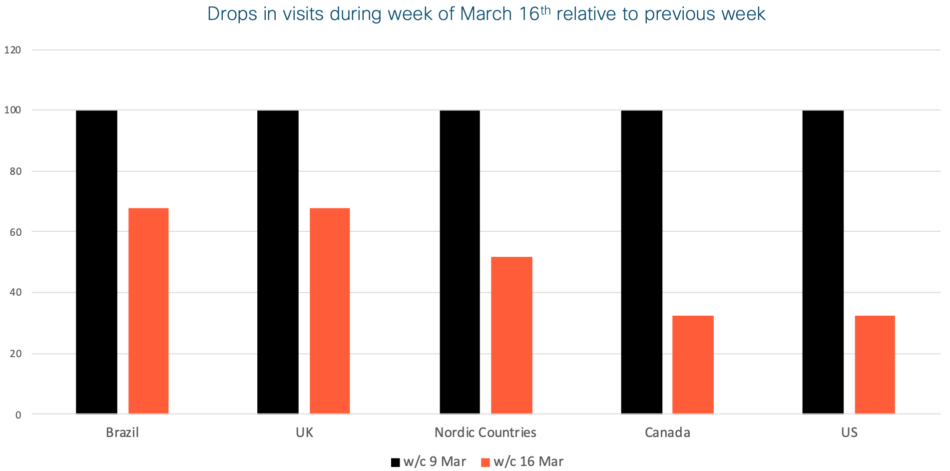 The data collected by Cisco DNA Spaces also aligns with this observation and shows that the drop in user visits was universal and happened across all geographies. Most countries experienced record drop-offs in the same week despite differing social distancing policies.