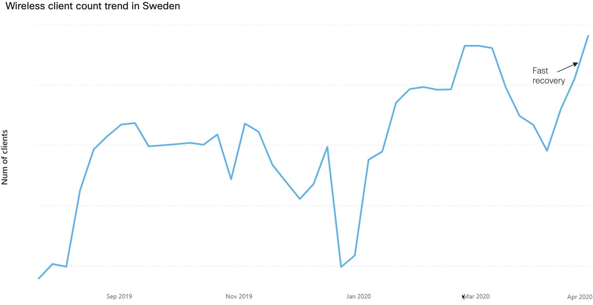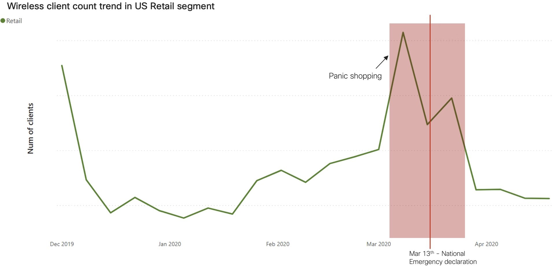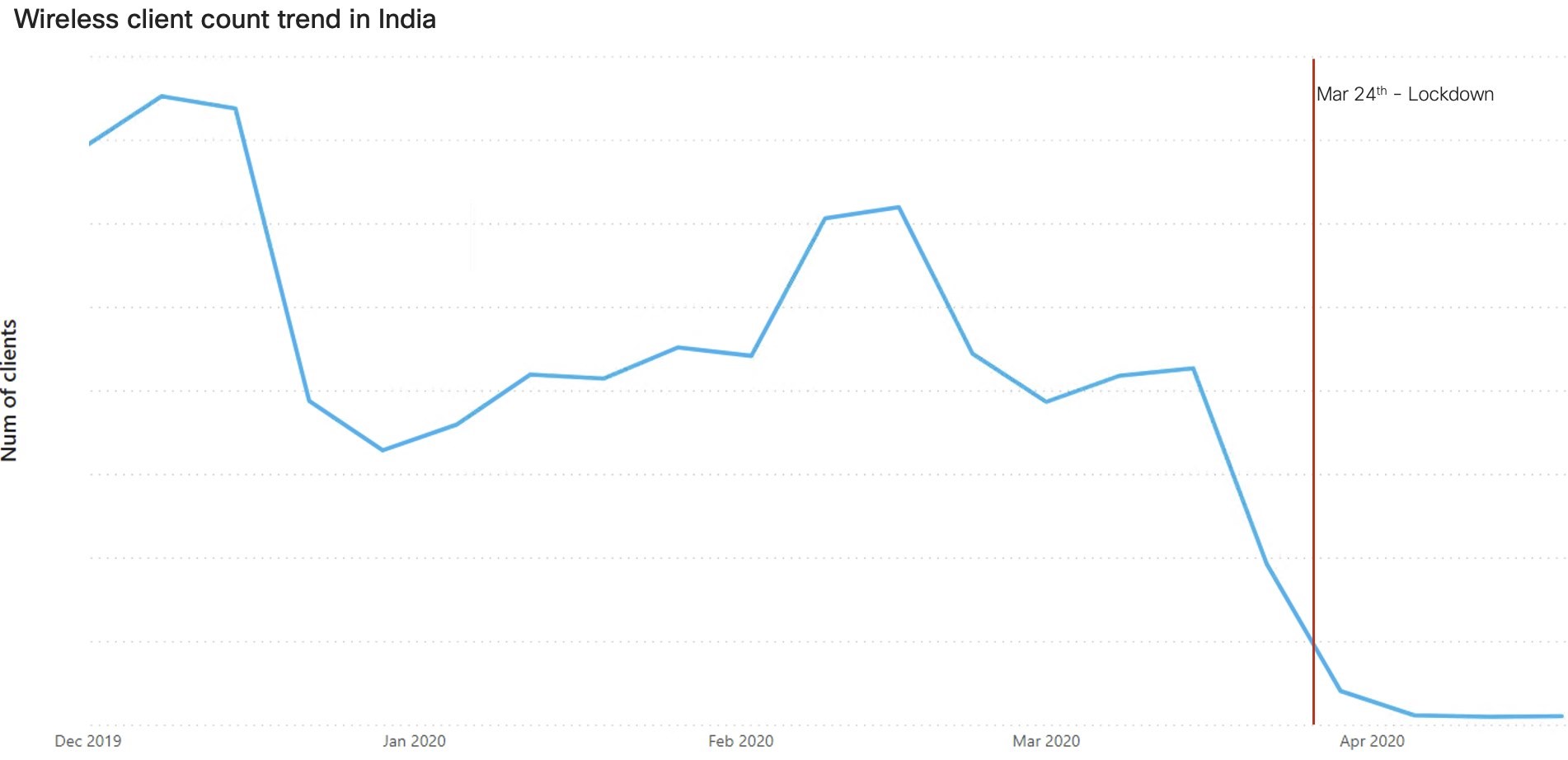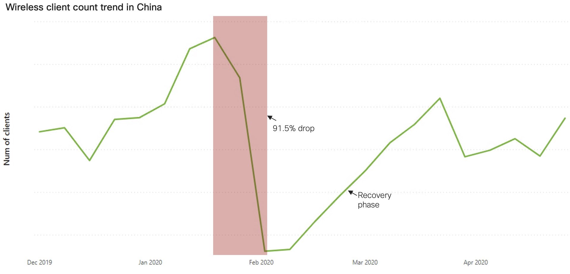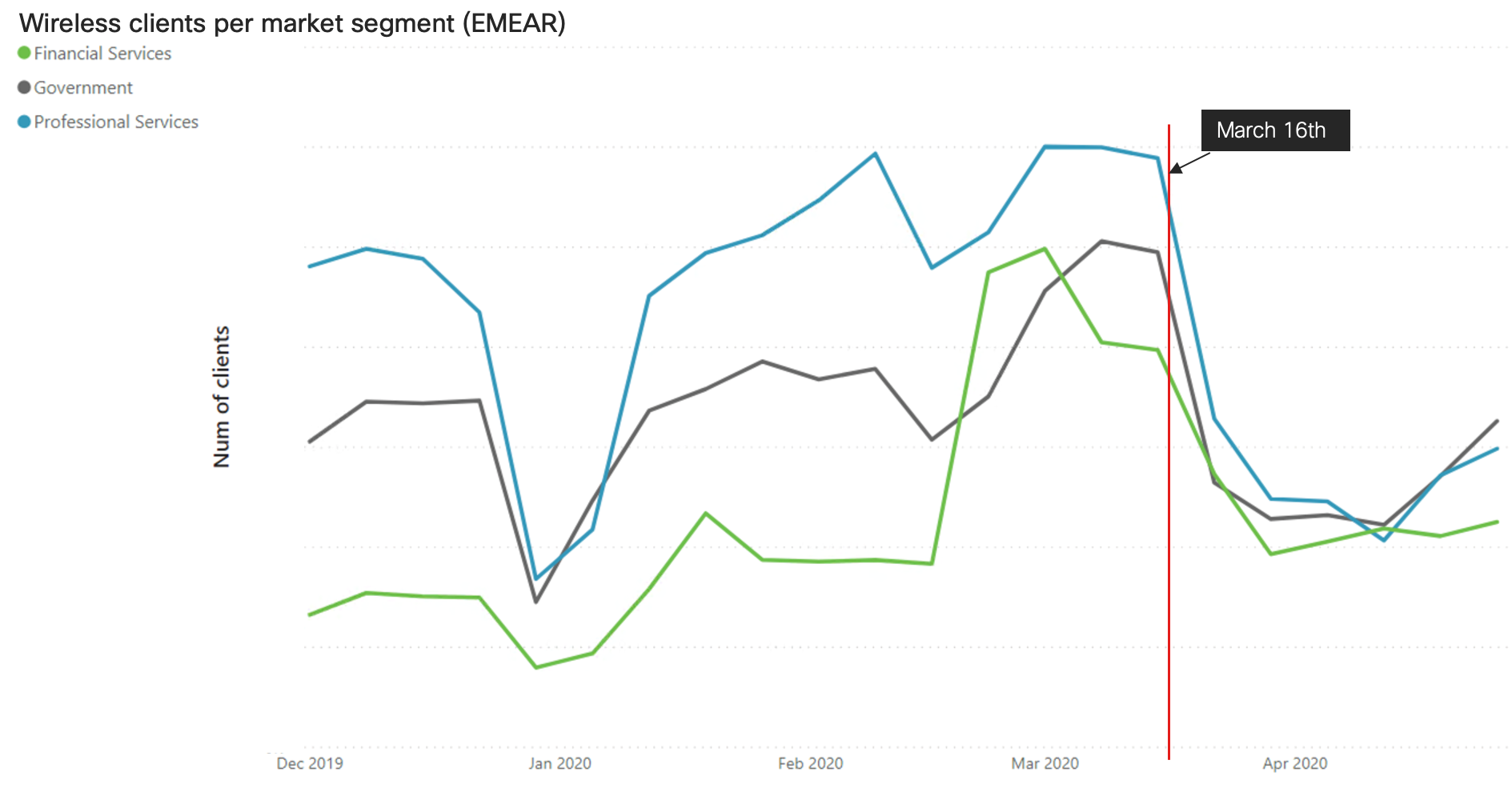 With the extensive anonymized data collected about Cisco’s wireless deployments around the globe through Cisco DNA Center and Cisco DNA Spaces, we can identify unique real-time insights into our customer’s deployments that will help businesses measure the impact this crisis has had across different regions, market segments and verticals. Such insights help industries to rearrange their priorities and develop new innovations to address blind spots that have been uncovered. The ability to capture, analyze and correlate data from millions of devices allows Cisco to help its customers answer complex questions about their business and better prepare for any future crisis.