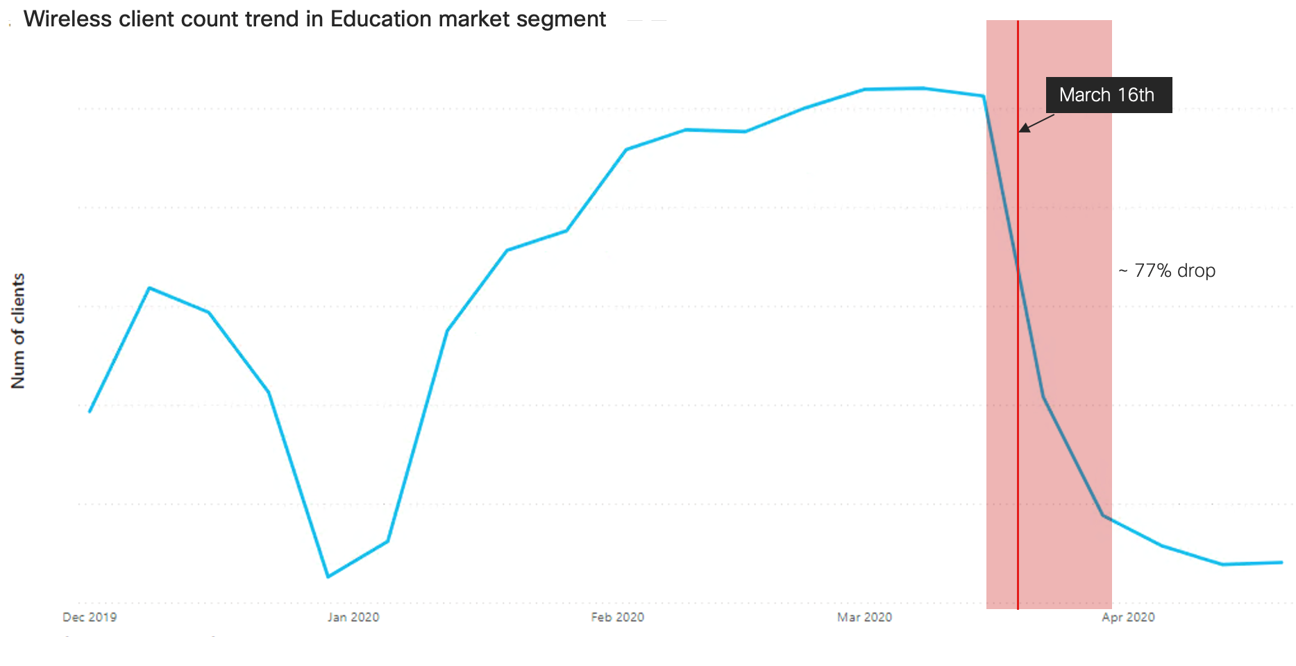 The Education segment is one of Cisco’s largest, with close to 1.5 million clients reported through Cisco DNA Center. With universities and schools closed down for the academic year two-and-a-half months early, this segment was severely impacted. The client count went down by 77.02% in the last three weeks of March: