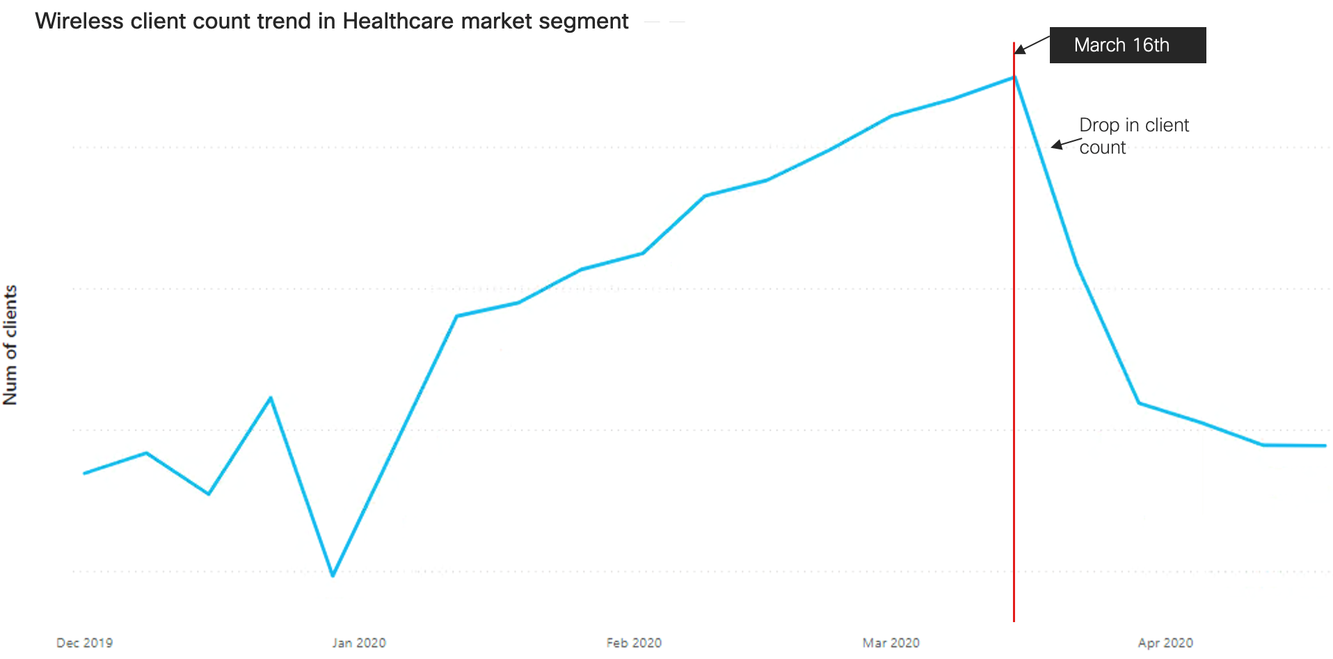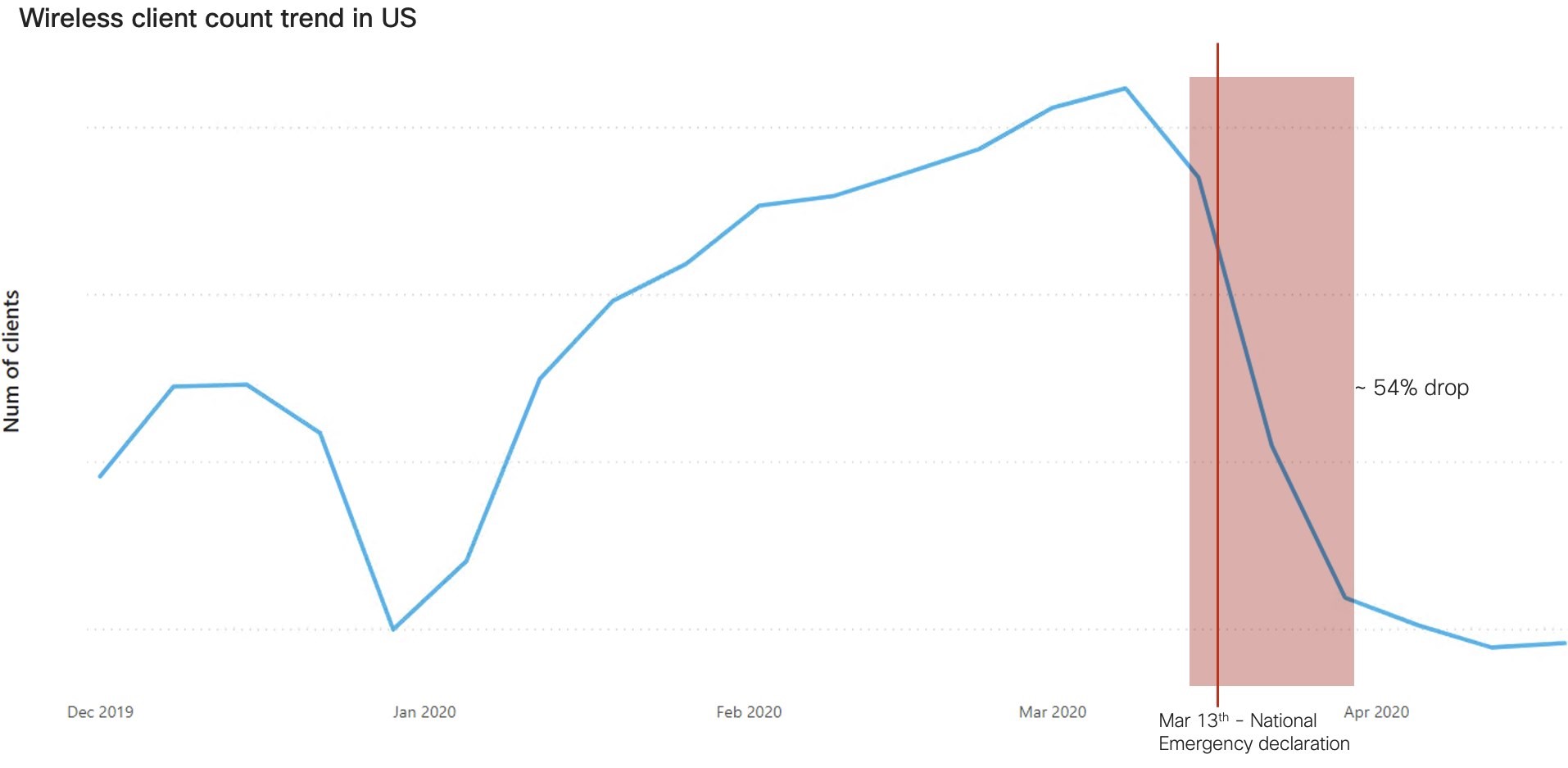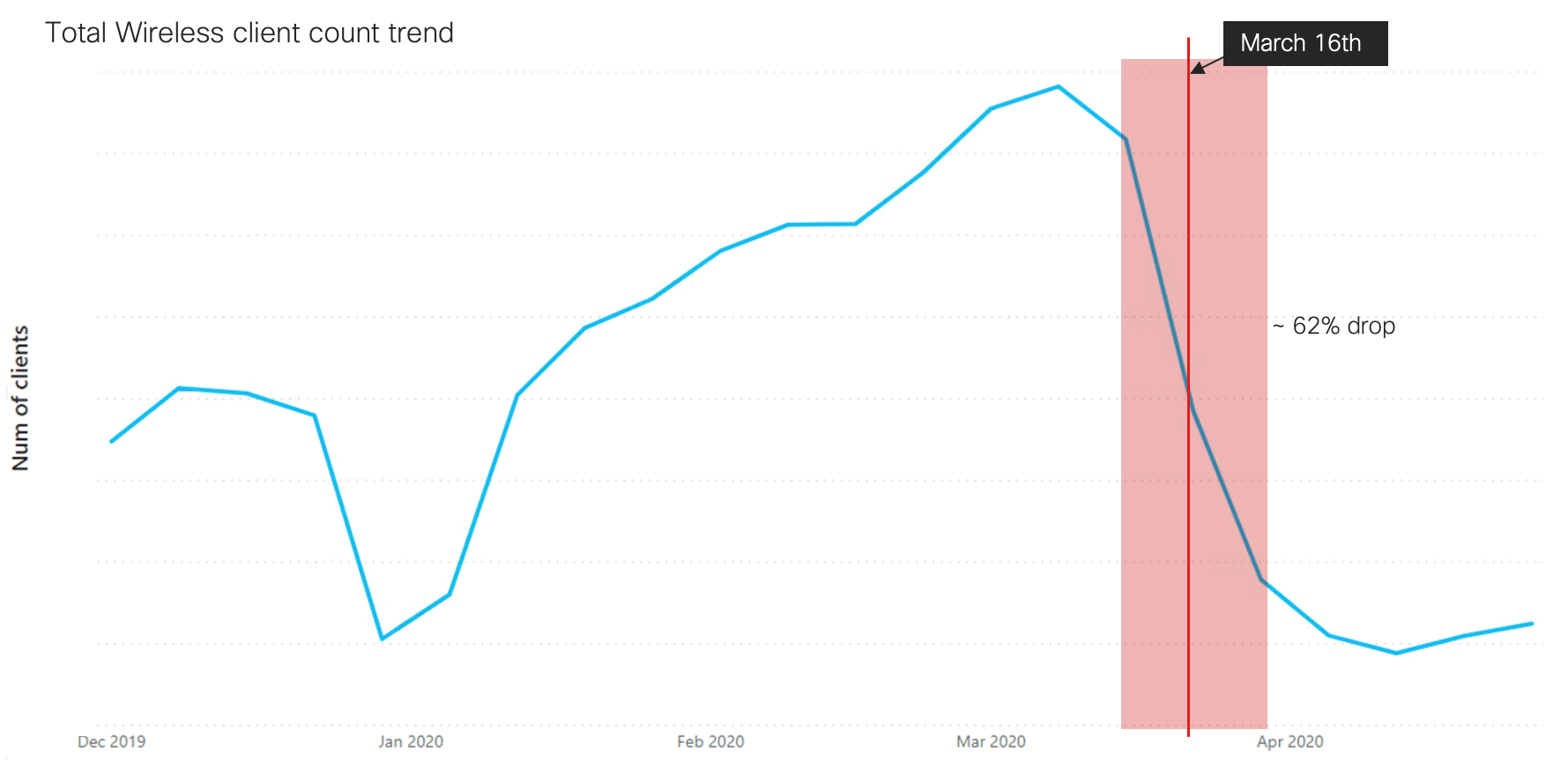 If we look at the overall wireless client count from Cisco DNA Center deployments around the world — including all regions and market segments — it began dropping in the week of March 16th with a sharp fall continuing until the end of March: