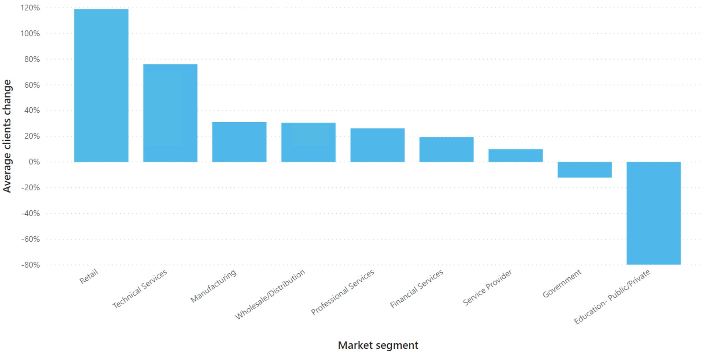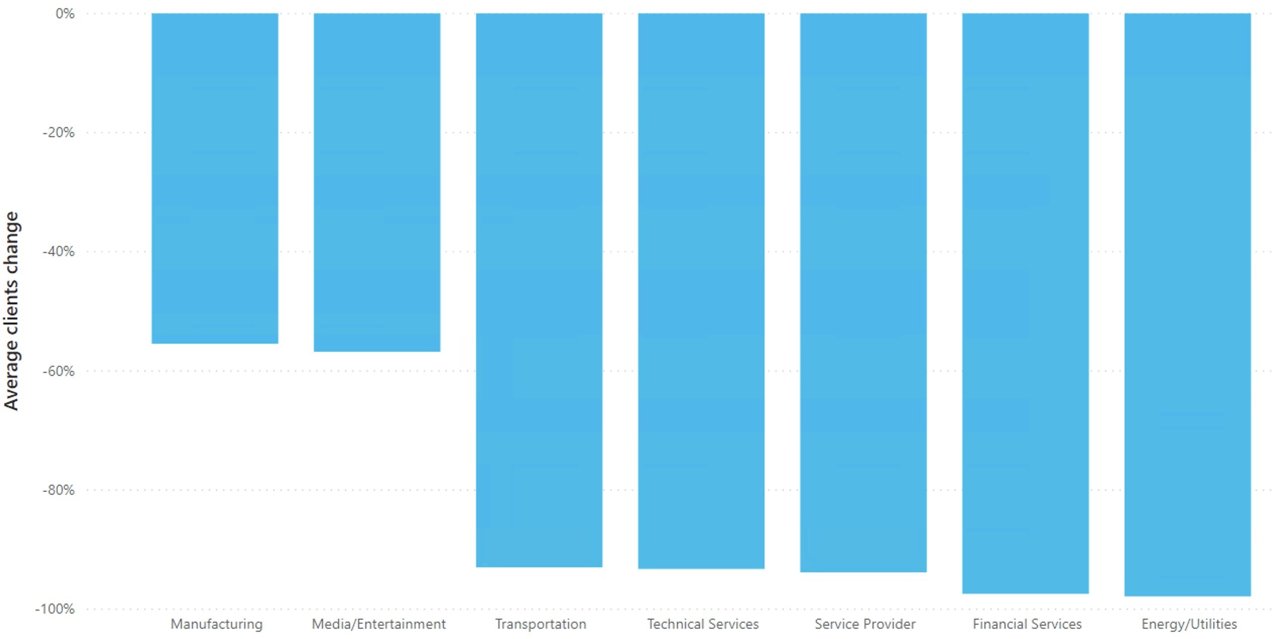 To measure the impact of user presence in different market segments, we take the latest client count for that segment and compute the percentage change from the historical average for that market segment. This analysis reveals the top three segments that were most impacted and least impacted:
