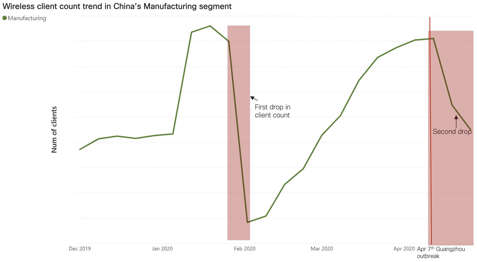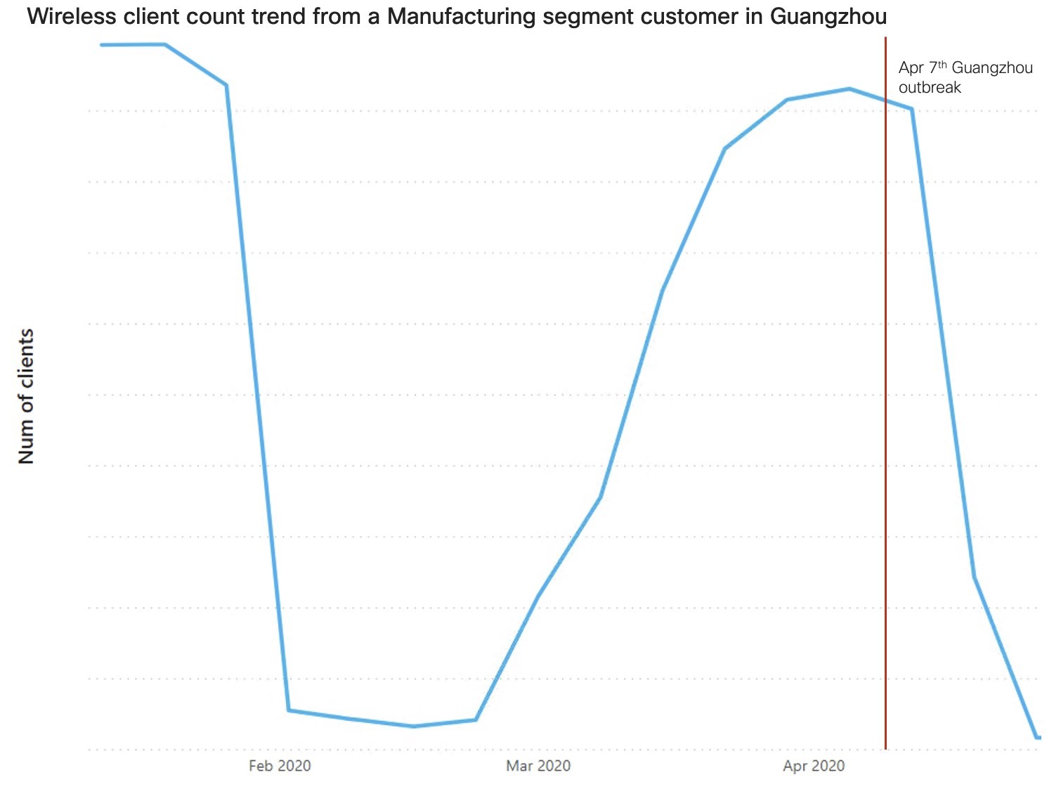 Looking at this a bit deeper, there is one customer from Guangzhou that had a much bigger contribution to the drop in the Manufacturing segment than the rest. The client count for this deployment dropped in April by 98.1% in two weeks and contributed to the overall drop for this segment. This correlates with the news of an outbreak in Guangzhou and the shutdowns in the region because of this localized outbreak.