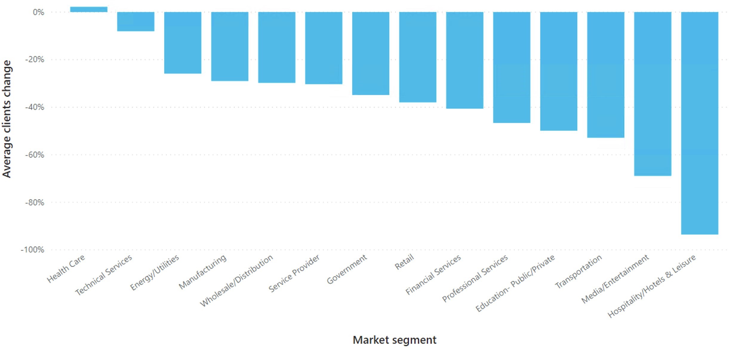 Other than Healthcare, all of the market segments in the US are showing a client count below the average. With social distancing becoming the norm and schools and universities shut down, market segments like Hospitality, Media and Entertainment, Transportation and Education have been hit the worst.