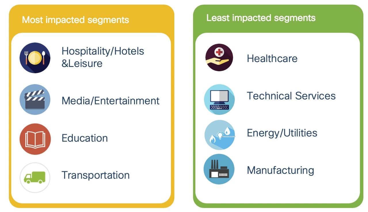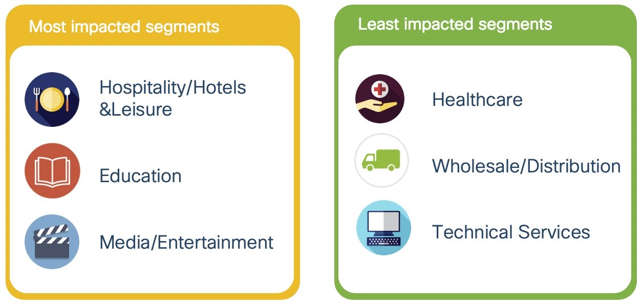 While the decline has been similar between the different regions, the recovery since the second week of April has been different. While the Americas and Asia Pacific, Japan and China (APJC) are showing a modest increase in client count numbers by 5.58% and 3.22%, Europe, the Middle East, Africa and Russia (EMEAR) region is leading the recovery with an increase of 49.43%. Within the EMEAR region, the biggest contributors to the recovery have been Professional Services, Government and the Financial Services segment.