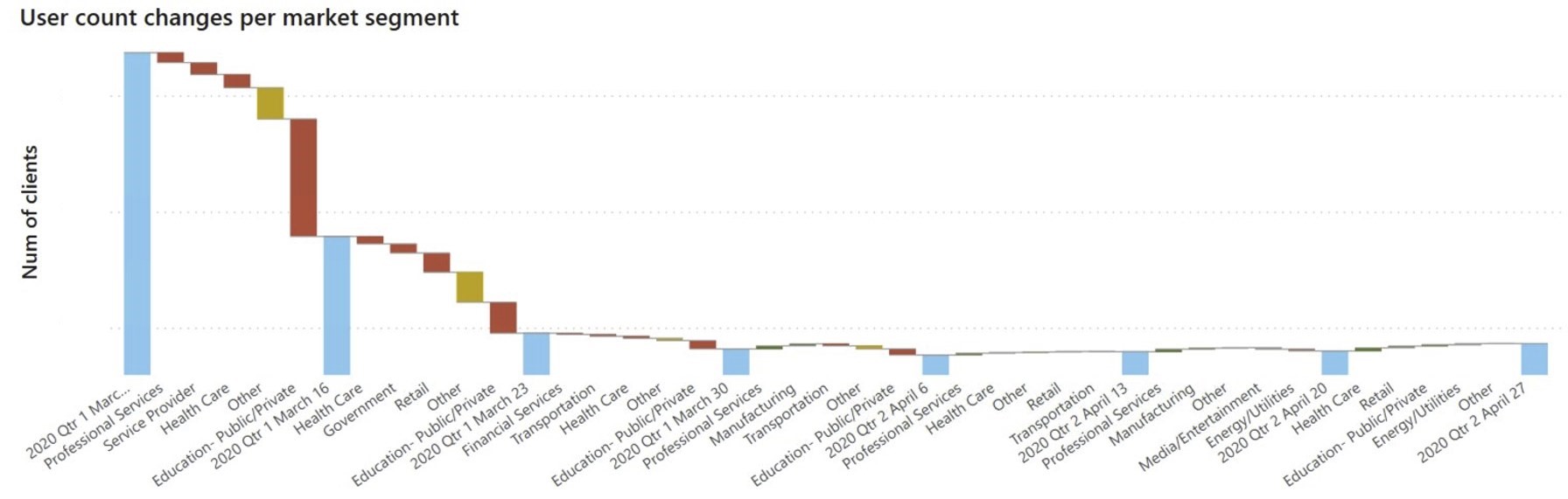 While China is showing growth with its top customers, the customers in the US with the highest number of unique client counts are still showing decline in count in the last week (as of April 27th). Since most of the large customers (as far as unique client counts goes) in the US are from the Education segment, this is expected. Schools and universities may remain closed until much later this year, so the recovery in this segment will take time.