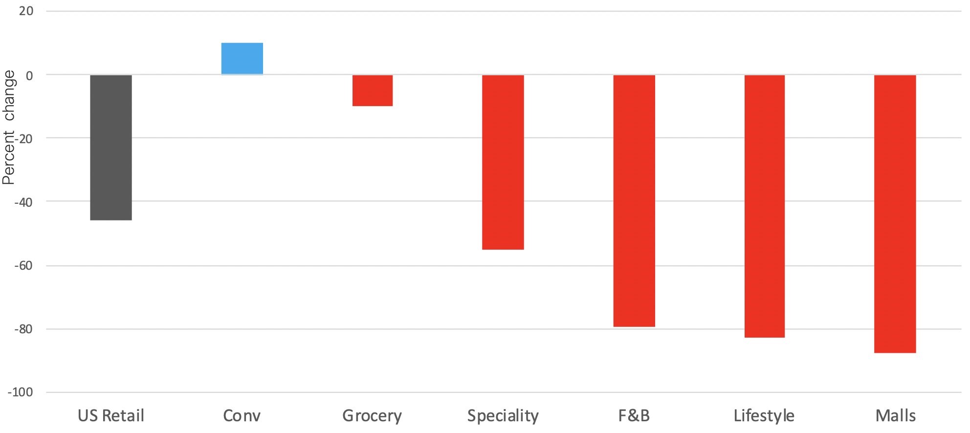 By looking at percentage change in weekly visits across the sub-categories in Retail between first week of March and last week of April, we see that Convenience and Groceries categories were less affected than other categories.