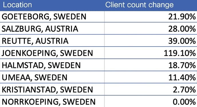 In the last few weeks of April, the EMEAR region has shown the fastest recovery (49.43% growth in client count since 2nd week of April) when compared to AMERICAS (+5.58%) and APJC (+3.22%). And within EMEAR, if we take a snapshot of the top few deployments with highest client counts, most of them are from Sweden, and the count is higher than average in the last week of April: