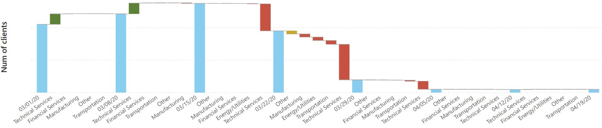 Looking at the week-by-week changes starting on March 9, we can see steep declines in multiple segments. We see a bit of a stabilization when April begins and then after the second week we see a slow increase in client counts across different segments.