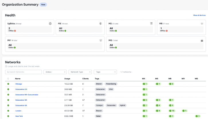The BEST view in the dashboard is the organizational summary. This is a quick way to see your entire org—not just network—from one screen, looking at the overall health. It’s so easy to see where a problem may be and get to it immediately. Rather than flipping between management interfaces and networks, you can get to the root cause almost immediately, from anywhere in your org.