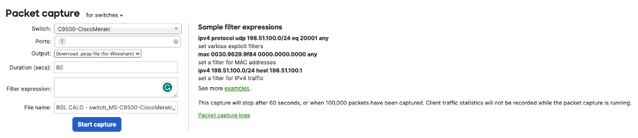 - Output: Select how the capture should be displayed: view output or download .pcap