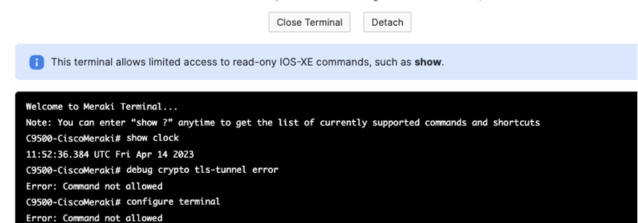 No context switching or management console changing to troubleshoot issues? You’re welcome. Command-line interface (CLI) shows commands via the Meraki dashboard that are a great way to enable remote validation of configuration and troubleshooting, without having to get direct access to the device via Secure Shell Protocol (SSH) or console.