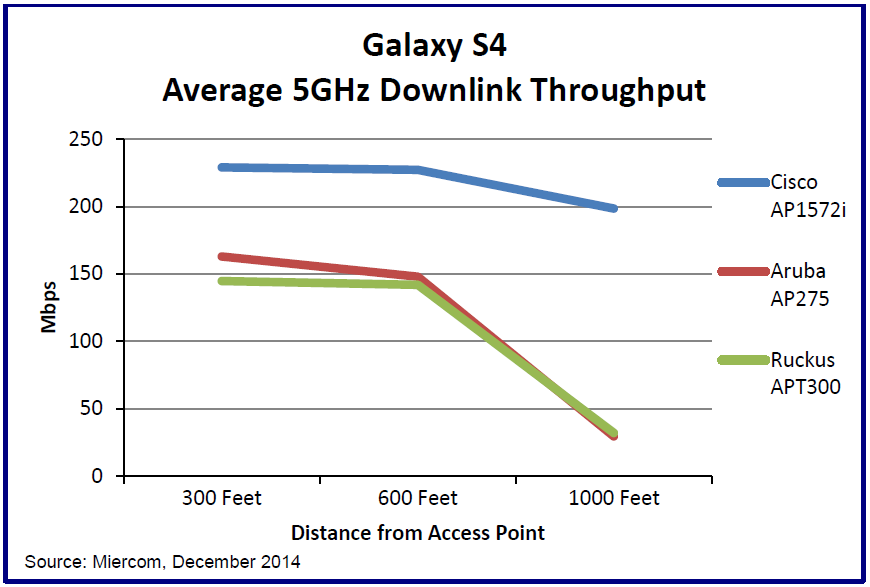Cisco 1572 AP’s 4×4:3 antenna architecture, combined with implicit & explicit beamforming, and the highest transmit power allowed by the FCC for an outdoor AP, directly complements to sustaining higher 802.11ac data rates even at longer ranges. Communicating at higher data rates allows the clients to transmit and receive more data traffic faster, thus obtaining a higher throughput performance. This theory can be realized from the 1000 feet mark in the graph above where Cisco 1572 delivers five times the performance as compared to either Ruckus or Aruba with a single spatial stream Galaxy S4 client.