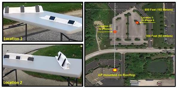 Achieving high performance at various distances matters, but only when it’s backed by consistency. To test the consistency factor, two sets of Apple’s recent 802.11ac capable iPhone 6 smartphones, a group of five in each set, were placed in the same outdoor environment. Five iPhone 6 were placed on a table at different locations at 350 feet and 500 feet as seen in the diagram below.