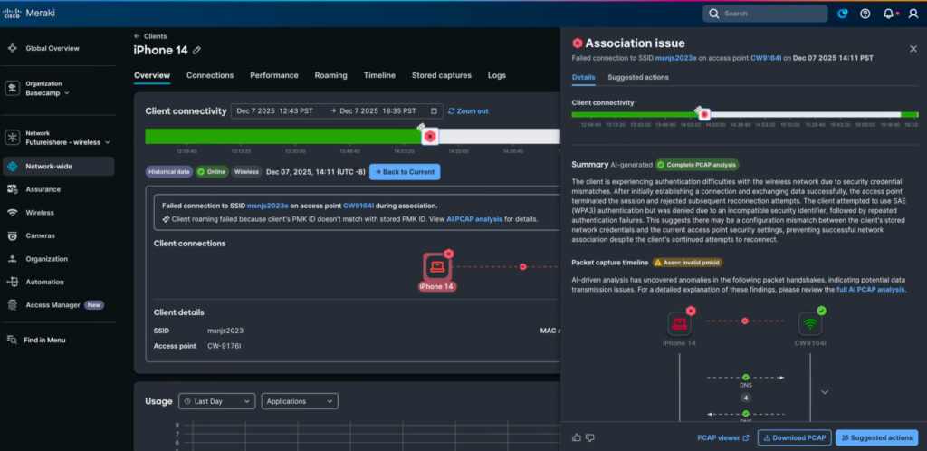 We’re also introducing updates to our AI Packet Analyzer, an advanced tool trained on over one million packet captures. Client connection issues that once required weeks of expert analysis can now be diagnosed in seconds—with precise root cause and historical context.