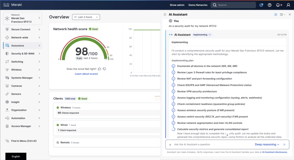 One thing to note here: our customers manage networks that span the full range of operating models—cloud, on-premises, air gapped, and often all of the above. That’s why we’re expanding access to these AgenticOps capabilities. Cisco AI Assistant is now available as a beta (request early access) for Catalyst Center, and we’re extending AgenticOps troubleshooting and optimization capabilities to industrial networks as well.