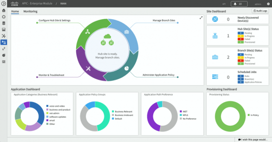 Cisco Application Policy Infrastructure Controller – Enterprise Module (APIC-EM) is the Cisco SD-WAN controller. The IWAN app on APIC-EM simplifies WAN deployments by providing a highly intuitive, policy-based interface that helps IT abstract network complexity and design for business intent. The IWAN Application is prescriptive of the Cisco Validated Design and provisioning of its core pillars for a large number of sites from a centralized location.