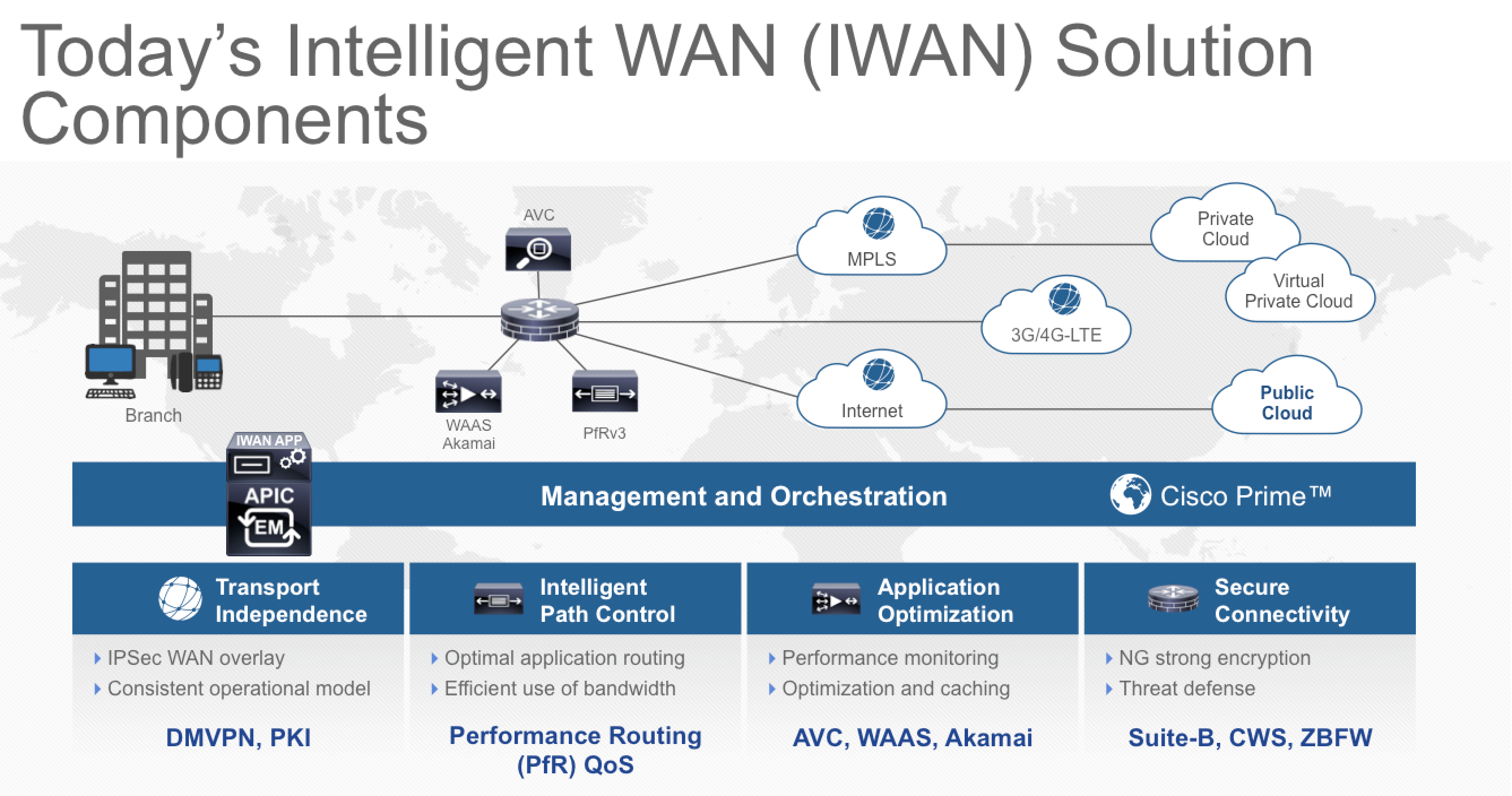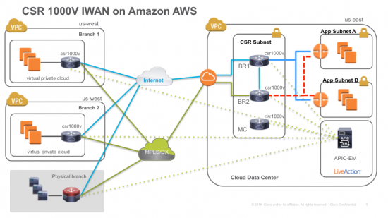 With the Cisco IWAN solution running on Cisco CSR1000v, a network admin can extend Cisco IWAN capabilities into a public cloud (AWS, Azure, Alibaba Cloud [coming soon]).