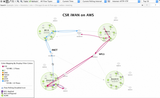 LiveAction is used to visualize traffic for PfR (Performance Routing) path selection. For example, the following diagram shows how “HTTP” traffic is routed through INET (Internet) while “FTP” traffic is routed through MPLS (Direct Connect) based on an application policy set in APIC-EM.
