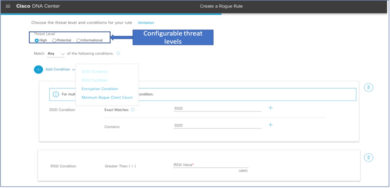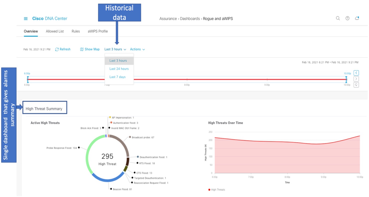 Cisco DNA Center: Cisco DNA Center provides simple workflows that allow users to customize aWIPS signatures and rogue rules. It constantly monitors, aggregates, corelates and classifies all the rogue events and alarms received from all the managed access. Using network intelligence as well as topology information, DNA Center accurately pinpoints the source of attack, and allow users to contain the attack before any actual damage or exposure occur.