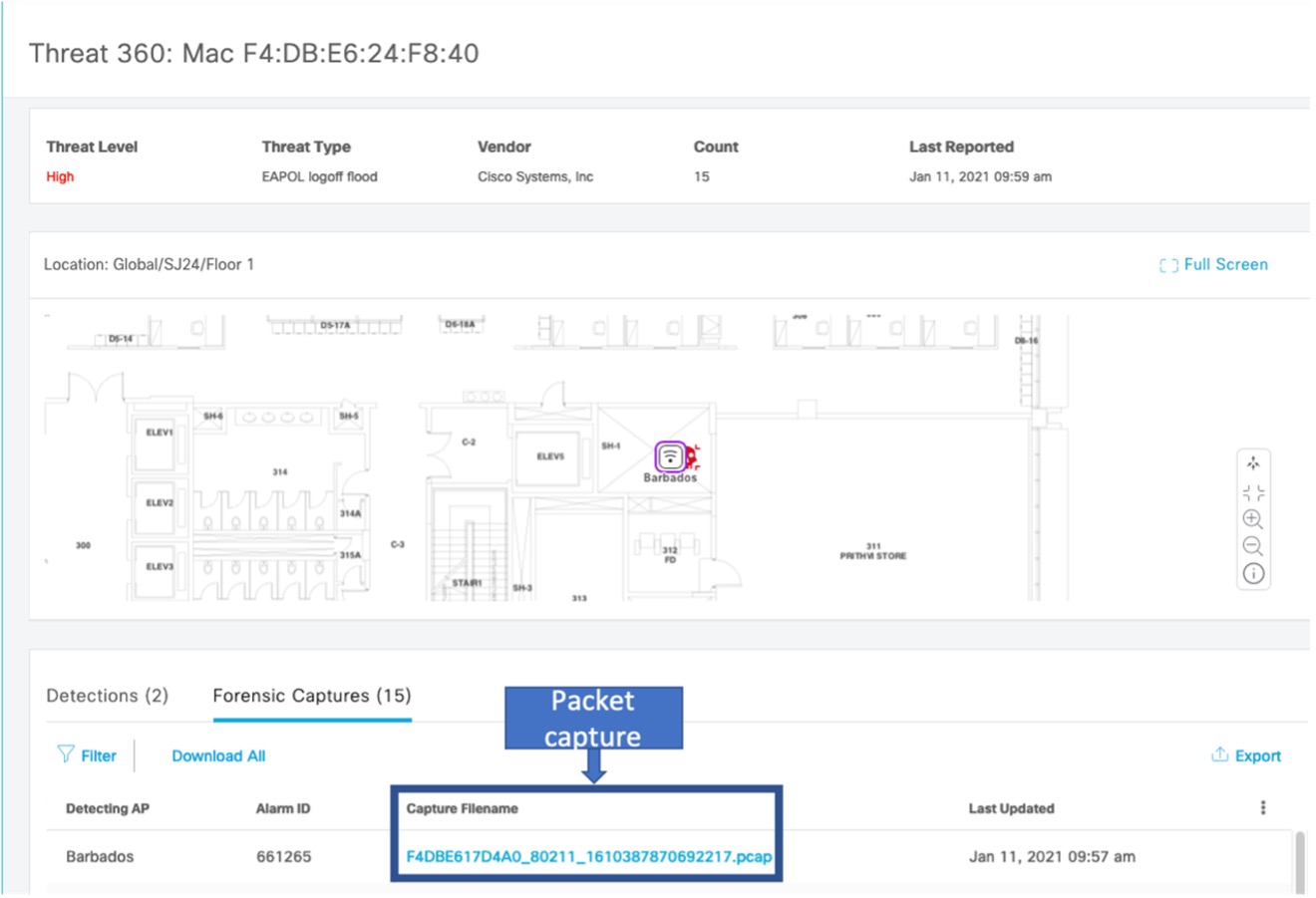 Sometimes there is an overwhelming need for evidence and post-analysis to get deeper understanding of the attacks in the network. With Cisco aWIPS you have an option to enable forensic capture per signature. When forensic capture knob is enabled for a signature, access points would capture raw packets during the attack timeframe and send it to DNA Center where the customers can view these packet captures. These packet captures can be used to analyze what is triggering the attack.