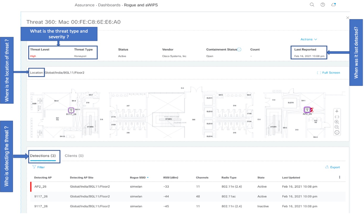 Cisco DNA Center Threat 360 view provides detailed view on each of the alarms:
