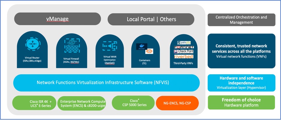 Cisco’s goal is to make it easy for both NetOps and DevOps to work together using the same dashboard to perform the entire process of registering, deploying, updating, monitoring VMs, and provision service chains with the easy-to-use Cisco Enterprise NFVIS Portal or Cisco vManage for SD-WAN. NetOps persona can perform each step of the VNF lifecycle management to deploy VNF-based service chains.