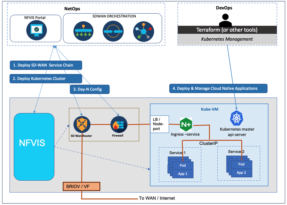 Ops team collaboration is made possible by Cisco Enterprise NFVIS and Cisco Kubernetes to power tomorrow’s applications across clouds and edge use cases. Deploying service-chained VNFs has enabled NetOps to simplify support for distributed offices, devices, and applications. Now Cisco Kubernetes in Cisco Enterprise NFVIS provides DevOps with a familiar set of k8s workflows to deploy containerized applications from on-premises to cloud to edge, taking full advantage of the service-chained VNFs managed by NetOps.