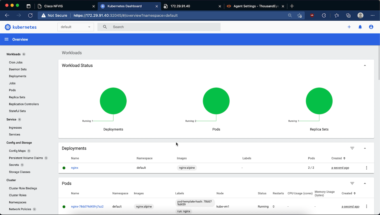 Cisco Kubernetes has a built-in Kubernetes Dashboard, enabling NetOps and DevOps Admins to use standard Kubernetes workflows to deploy and manage networking and application VMs. NetOps Admins acquire access tokens in NFVIS via the built-in GUI Local Portal or NFVIS CLI to access a Kubernetes Dashboard running inside Cisco Kubernetes. NetOps personas can execute their role in establishing VNFs and then hand off administration tokens to DevOps personas to access the Kubernetes Dashboard within Cisco Kubernetes. DevOps uses the dashboard to instantiate and manage their application containers. VNFs can be service chained with applications inside Cisco Kubernetes via an ingress controller that is deployed as part of a Kubernetes cluster to provide load balancing and ingress controls.