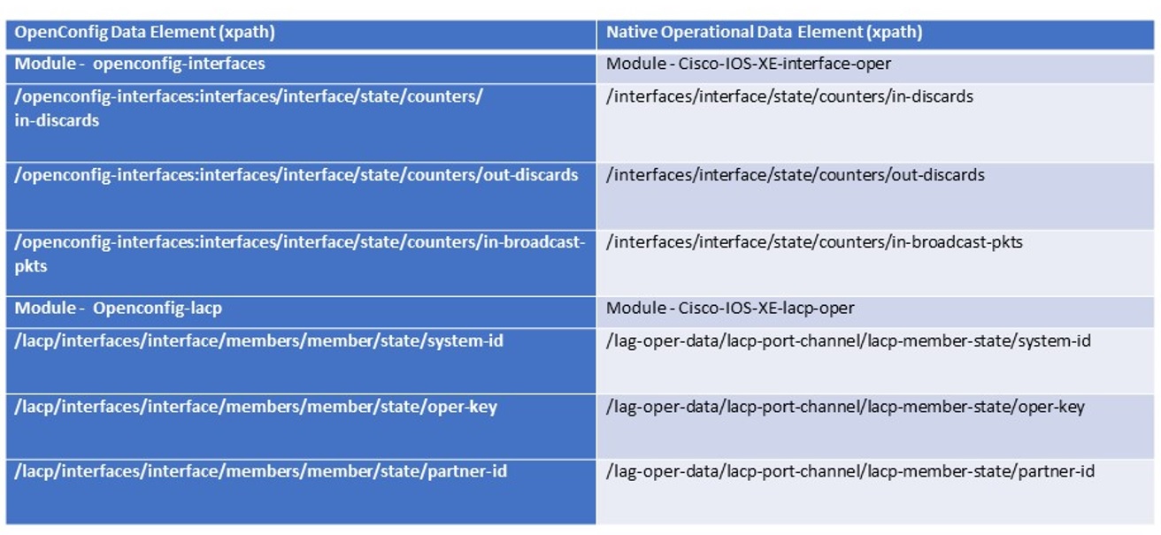 Typically, we request a configuration or operational data elements, like those listed in Figure 3, and a corresponding native data element associated with it. Cisco IOS XE provides infrastructure to translate the OpenConfig data element to the corresponding native data element. So, the process of supporting OpenConfig models is typically not very hard if the native models for the corresponding OpenConfig models exist.