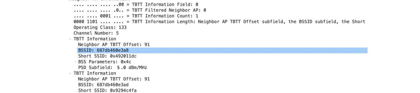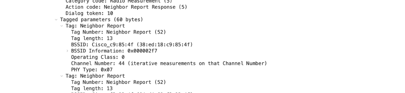 The information contained in an RNR is very similar to the information provided in the previously introduced 802.11v [1]action frame. The RNR below is from a 5GHz beacon and is advertising two SSIDs on the 6GHz channel number 5. The legacy 802.11v action report below shows similar information to the RNR but the fundamental difference is twofold: