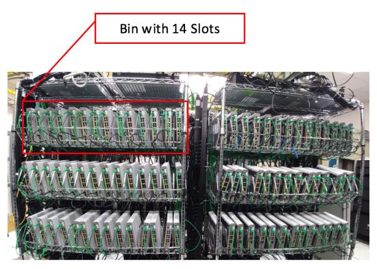 We started off by building racks that we used to stage 3560cx switches. Each rack can hold 42 switches. We broke up each rack logically as bins and slots to make it easier to manage. As you can see below each rack has 3 bins and each bin has 14 slots.