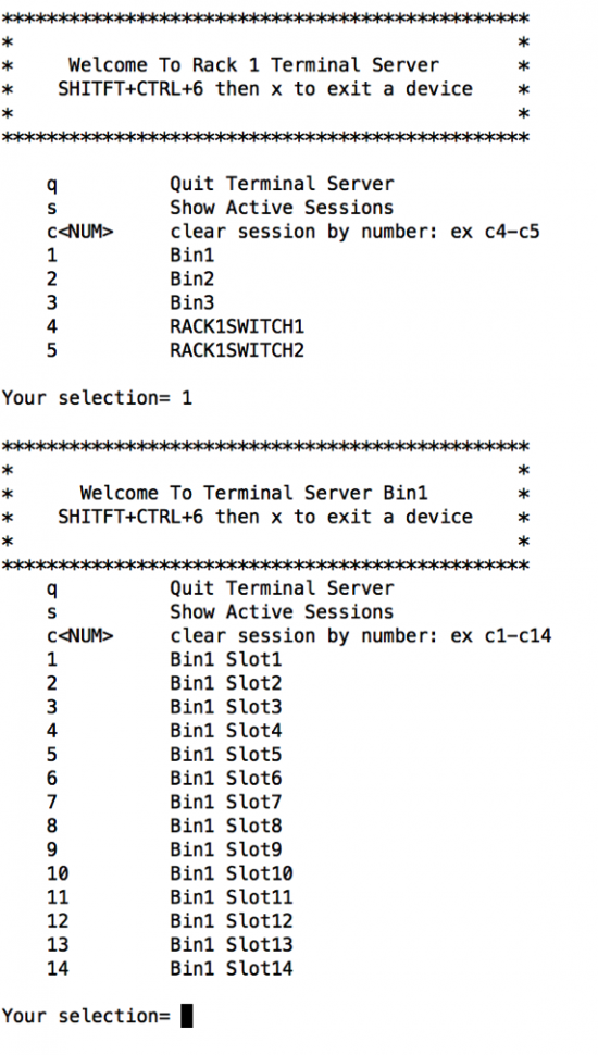 Each slot has power, Ethernet and a console connection. Power is connected to a network controlled PDU so each slot can be turned off and on individually. Console cable connects to a terminal server that has a menu created that lists which line connects to which slot. Ethernet all runs back to a 3850 to provide network connectivity (and POE if APs are being staged). The 3850 uplinks to the network.