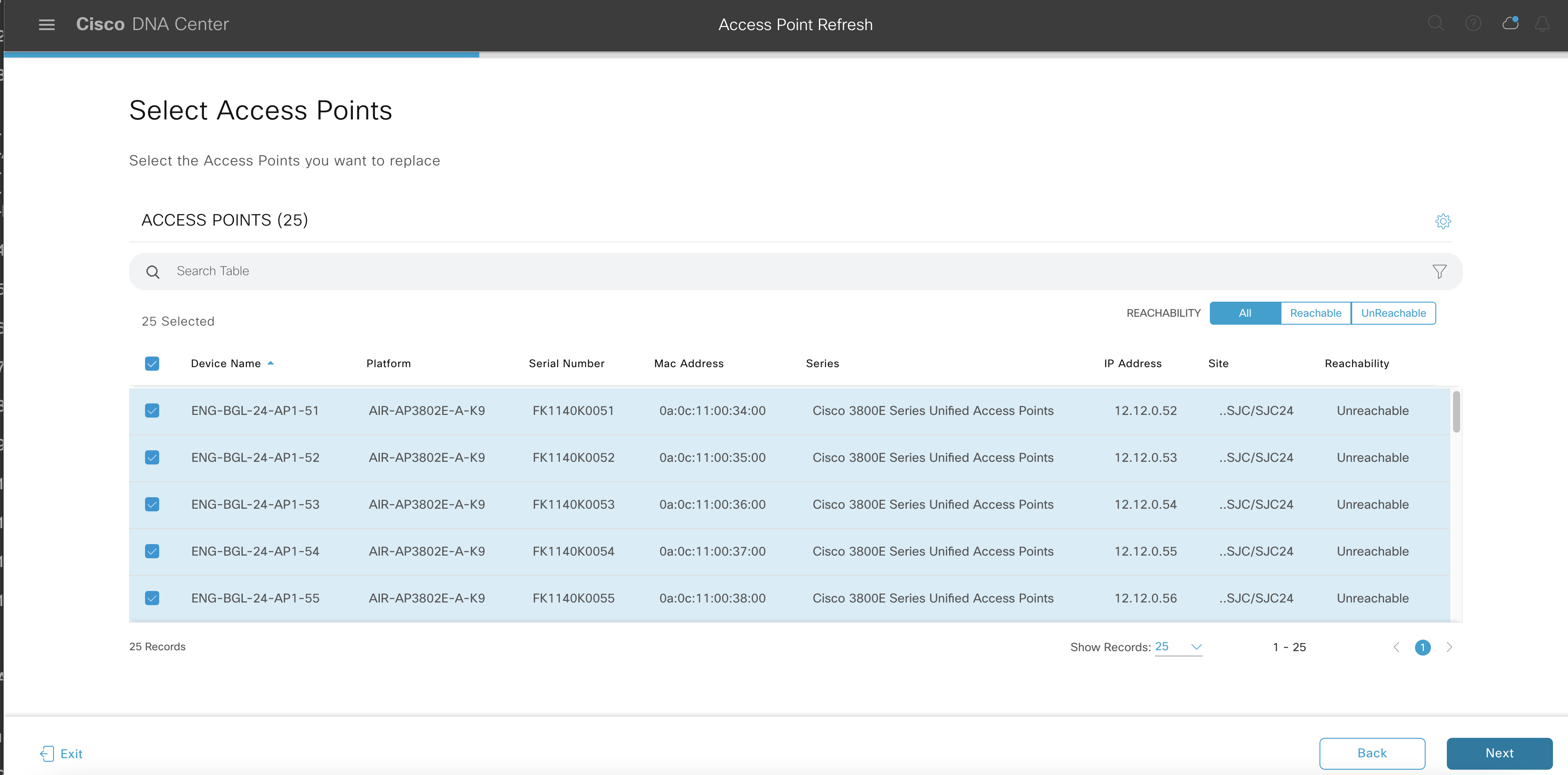 - In the workflow, the network administrator should select the site(s) and then the access points of those sites for replacement.